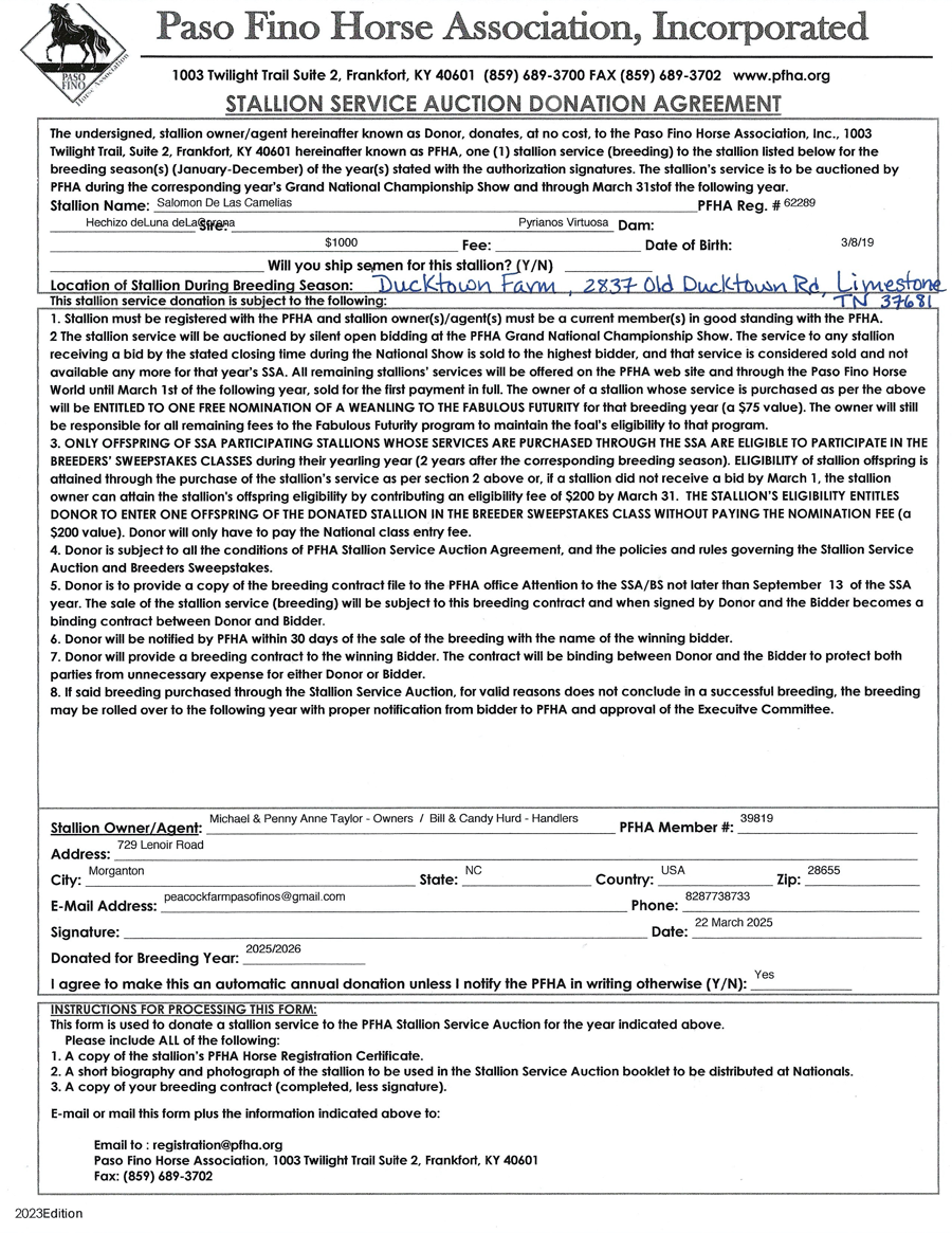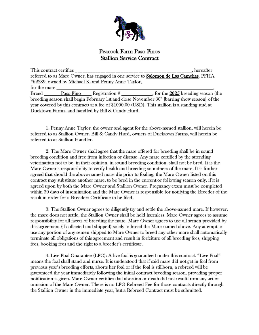 Salomon is a 2019 stallion who has performed well in multiple divisions. He is the 2024 Grand National Champion Bella Forma Stallion. He is the 2023 Amateur National Champion 4-year-old Performance Colt. He is the 2024 Amateur Fino Reserve National Champion in 5-6 years and will be competing again in 2025 in this division. While these championships speak highly of his confirmation and gait and presence in the arena, his greatest attribute by far is his demeanor. He is a full package - He’s got height at 15.2 hands! He’s got an amazing confirmation – such a pretty boy, with luxurious mane and tail! He’s intelligent and very biddable! He’s quick and steady! And, incredibly, he is sweet and loving with an amazing disposition! See for yourself – visit us in Barn Y at GNS with Ducktown Farms! We are Peacock Farm Paso Finos, Michael & Penny Anne Taylor.
