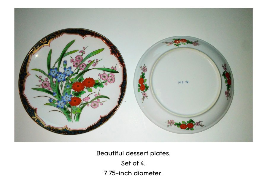 A vintage set of 4 floral design dessert plates with gold trim, 7.75-inch diameter. These are in like new condition. The picture shows the top and bottom of a plate.