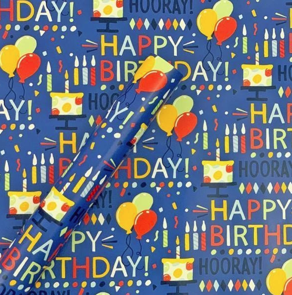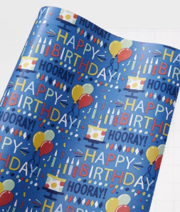 Let your gift giving speak for itself when you present a birthday gift wrapped in the Happy Birthday Script and Balloons Gift Wrap from Spritz™. This birthday wrapping paper pops with the repeating message "Happy Birthday!" and images of cakes, candles and balloons in vibrant colors against a blue backdrop. The word "Hooray!" is also incorporated in dark text for a more subtle yet still celebratory feel. The roll has eight feet of wrapping paper, giving you plenty for multiple presents or to get you through multiple birthdays.
