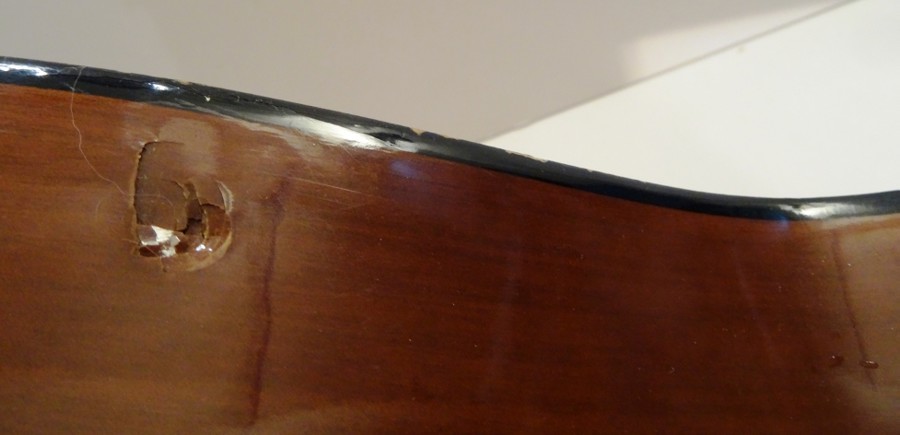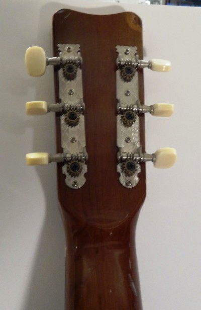 Not much is known about this Hohner six steel string guitar except that it was purchased at a yard sale across the street from the Belmont house where Joan Baez once lived. It is in good condition but has a small one-half inch round damaged spot – see picture. It comes with a nice carrying case, some extra pics, and a new Snark clip-on Chromatic tuning device with instructions. A friend produced some nice sounds with it.