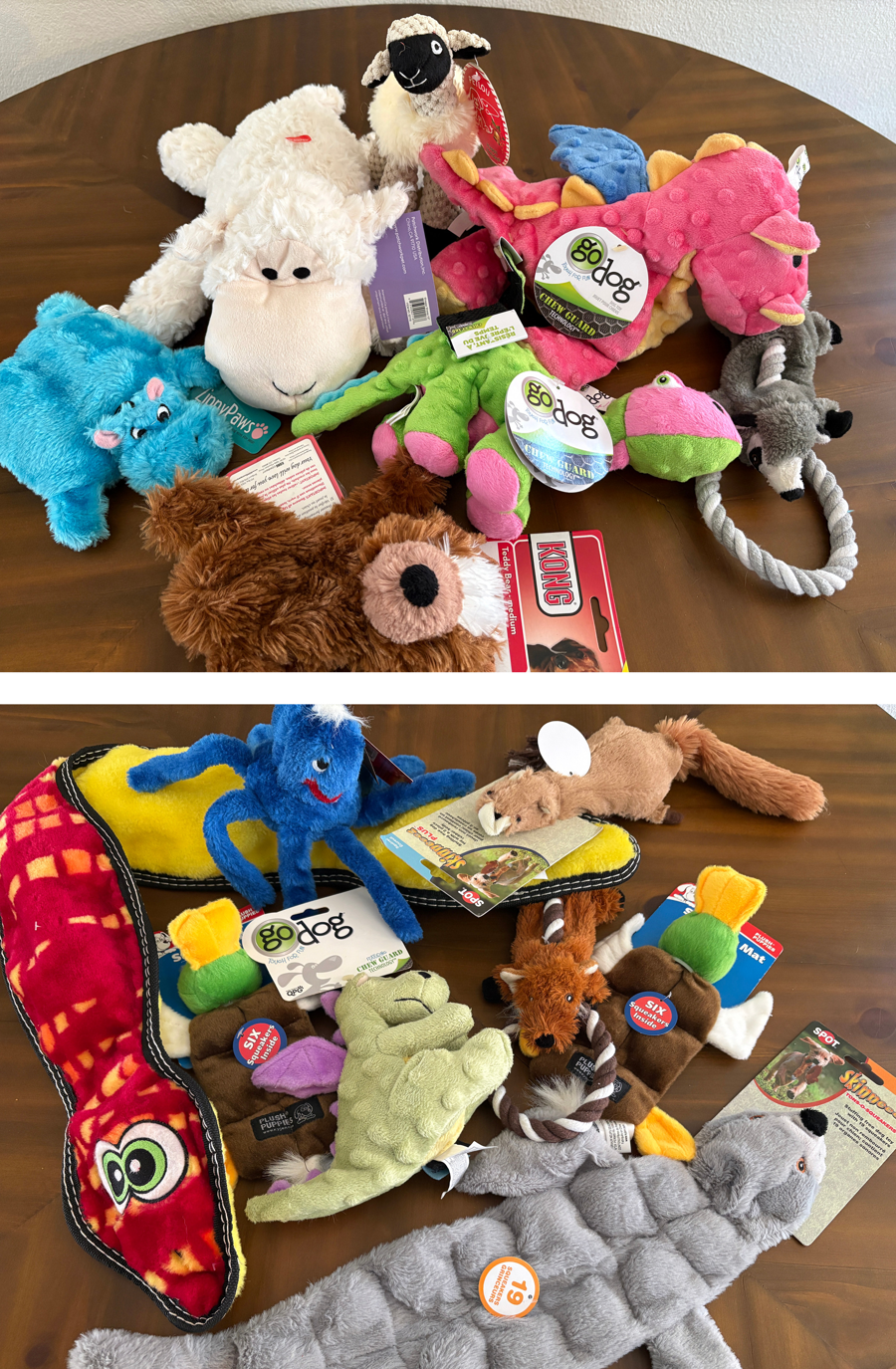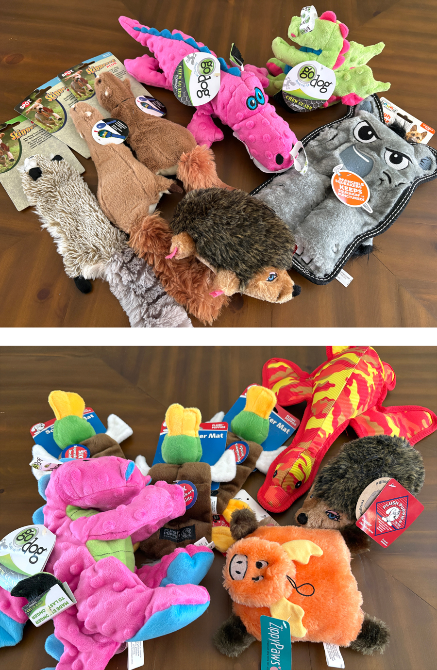 Treat your dog(s) to a delightful array of stuffed toys from little to large. More than 2 dozen toys will provide plenty of fun and variety. Favorites are “Outward Hound”, “Go Dog” and “Spot” brands as well as plenty of others - some squeekless, some stuffingless, some with tuff-guard fabric to last longer!