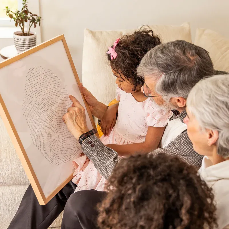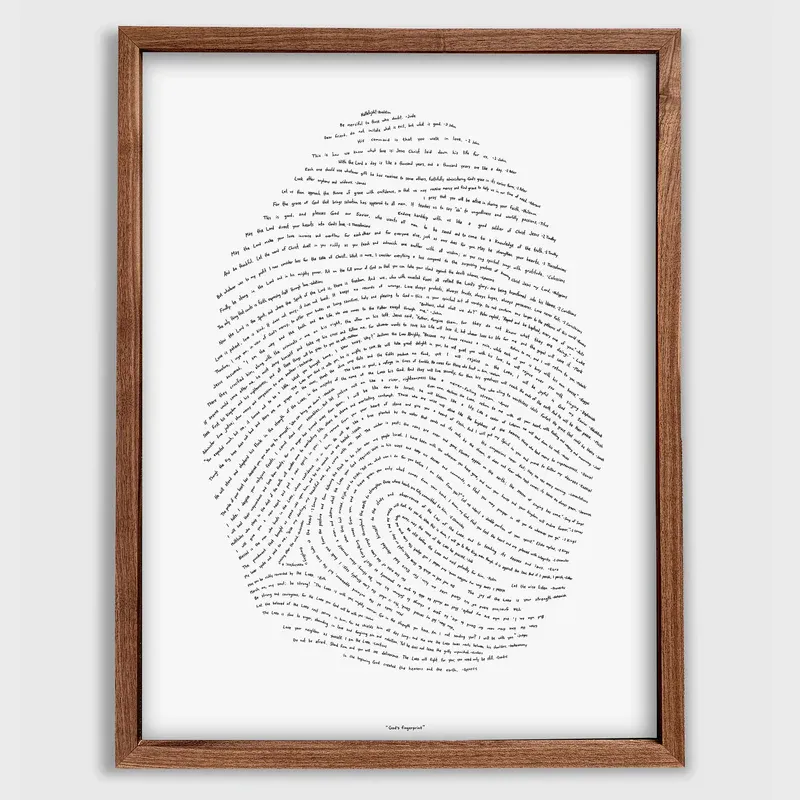 A truly unique piece of framed 16x20 artwork featuring one hand-written verse from every book of the Bible (New International Version). Each verse is drawn within the lines of a fingerprint. It begins at the bottom with Genesis 1:1 (“In the beginning…”) and ends at the top with “Hallelujah!” from Revelation. Every book of the Bible is represented in between. God’s Fingerprint® is a meaningful gift for anyone who loves God’s Word. This Classic Edition is printed using traditional letterpress, impressing each verse into thick fine art paper with rich black ink.