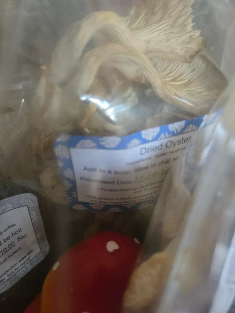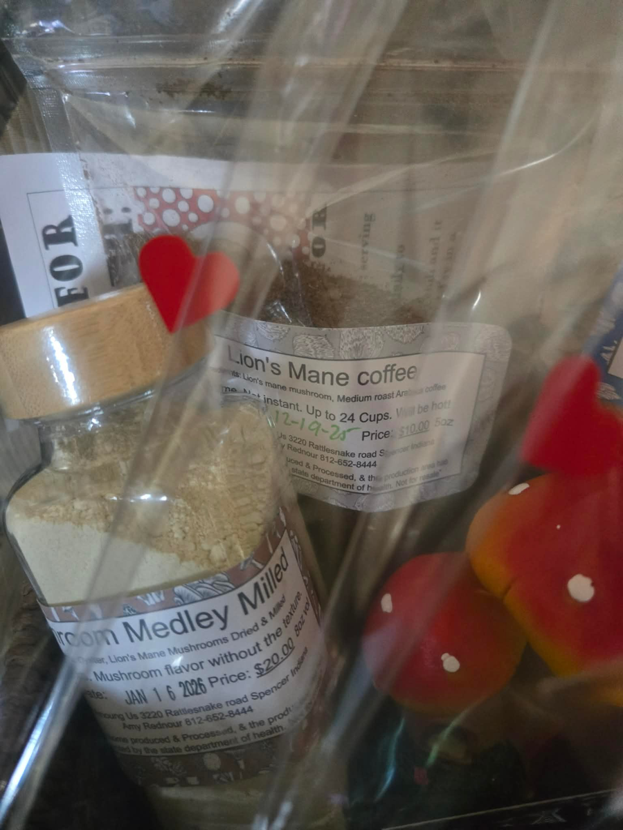 A Fungus Amoung Us has provided a gift basket filled with the following items: Lion's mane mushroom coffee, large mushroom mix seasoning, a dehydrated oyster, a dehydrated Lions mane, and a mushroom decor.