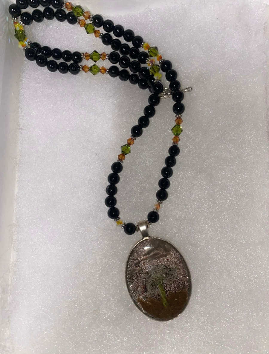 Necklace pendant named "A great place to Howl." The design was based in Crested Butte, CO. The pendant is made of mica and old man's beard from Crested Butte, CO. There is also yucca, sand and wolf fur from Wild Spirit. The pendant is made from a metal-zinc alloy. The necklace itself is a mix of black onyx, Swarovski crystal and zinc-based alloy. Has a silver slip through clasp. Size, unknown. This beautiful necklace was handmade by Aly Shine Jewelry!
