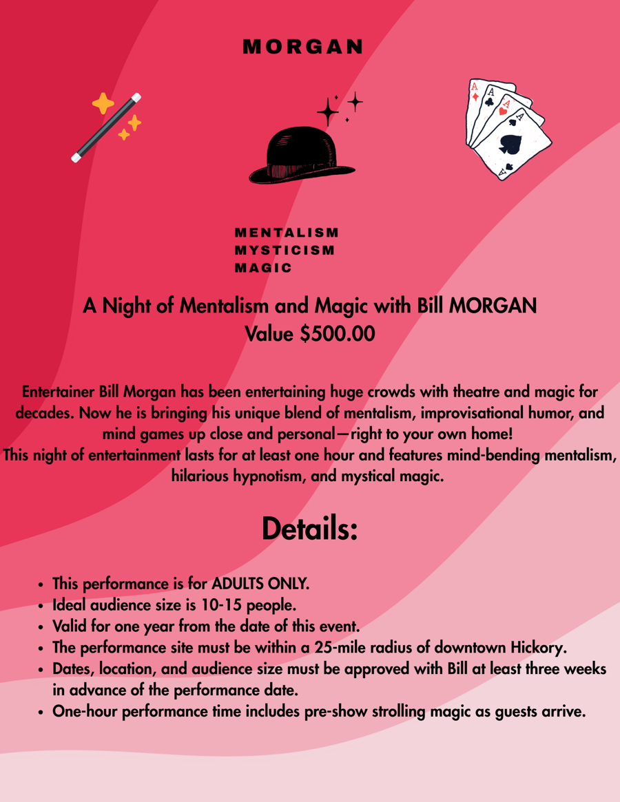 Entertainer Bill Morgan has been entertaining crowds for decades. Now he is bringing his unique blend of mentalism, improvisational humor, and mind games up close and personal- right to your own home! This night of entertainment lasts for at least one hour. Ideal audience size, 10-15 people. Adults Only and 30 min from downtown Hickory.
