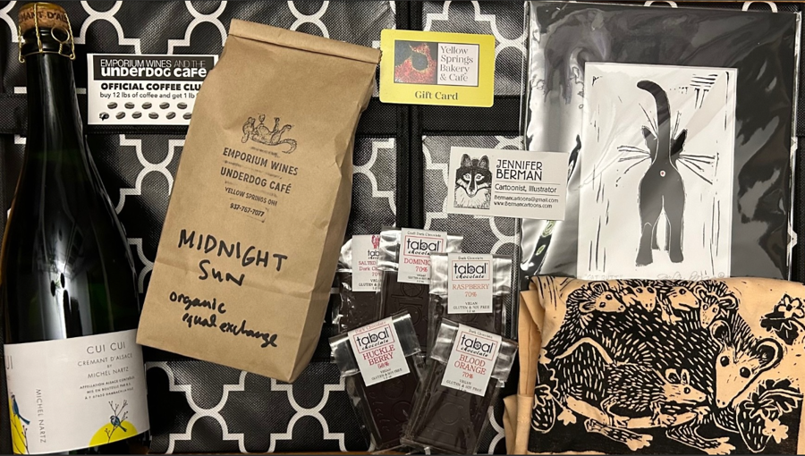 Looking for a few holiday gifts or something for yourself? This basket has a variety of tasty, fun and delightfully whimsical items from some of Yellow Springs' most popular spots! This package includes: A bottle of sparkling French wine, hand made chocolates, and a pound of organic coffee from The Emporium. emporiumwines.com A $75 gift card good for any purchase at Yellow Springs Bakery. A delightful possum family t-shirt, size medium with scooped neck. And a matted cat print from Jennifer Berman Designs. www.bermancartoons.com