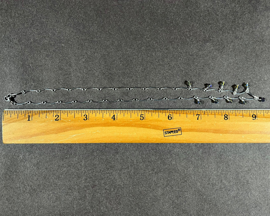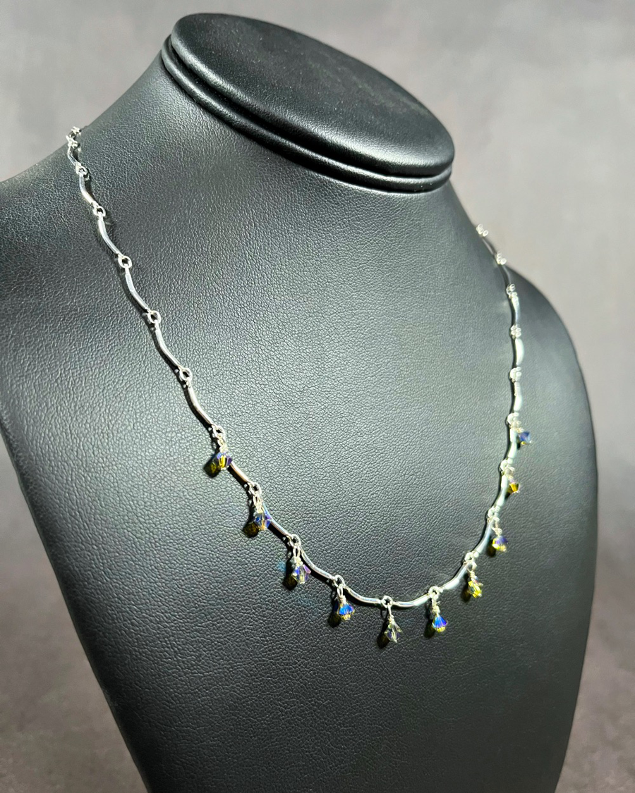 An 18" scallop chain necklace in sterling silver wit Swarovski Crystals, just the right amount sparkle for any outing. Made my Mig Lemire in Scarborough, Maine.