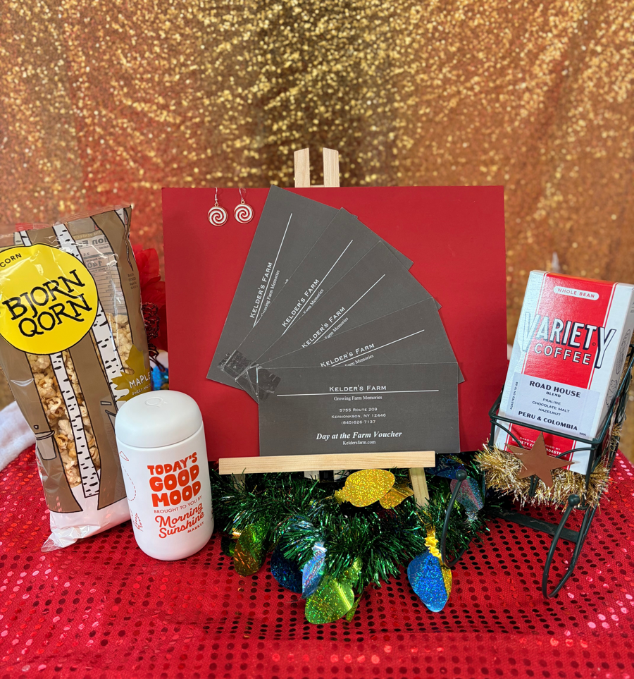This bundle contains 5 tickets to Kelders Farm, a Carter move mug from Morning Sunshine that comes with a splash guard, a variety coffee box, earrings, and a bag of Bjorn Qorn popcorn.