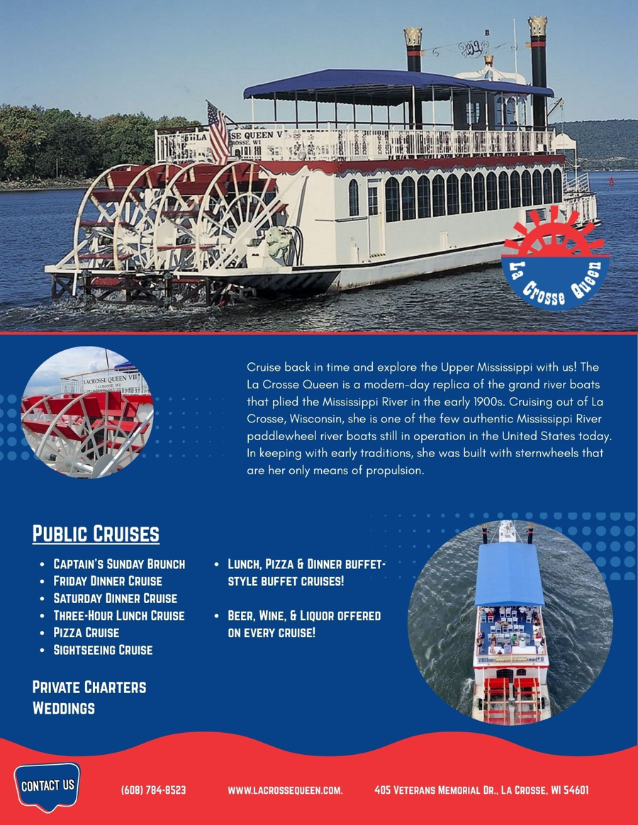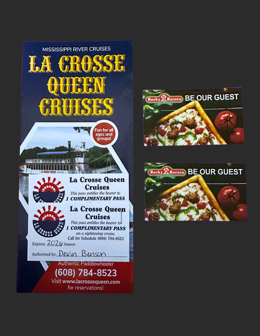 Experience a breathtaking "View from the River" with our exclusive auction item! This incredible package includes a scenic sight-seeing cruise for two on the majestic La Crosse Queen, where you can relax and take in the stunning landscapes along the river. To make your outing even more delightful, enjoy delicious pizza from the renowned Rocky Rococo. Don't miss this opportunity to create unforgettable memories with a perfect blend of adventure and culinary delight! Bid now for your chance to win this unique experience!