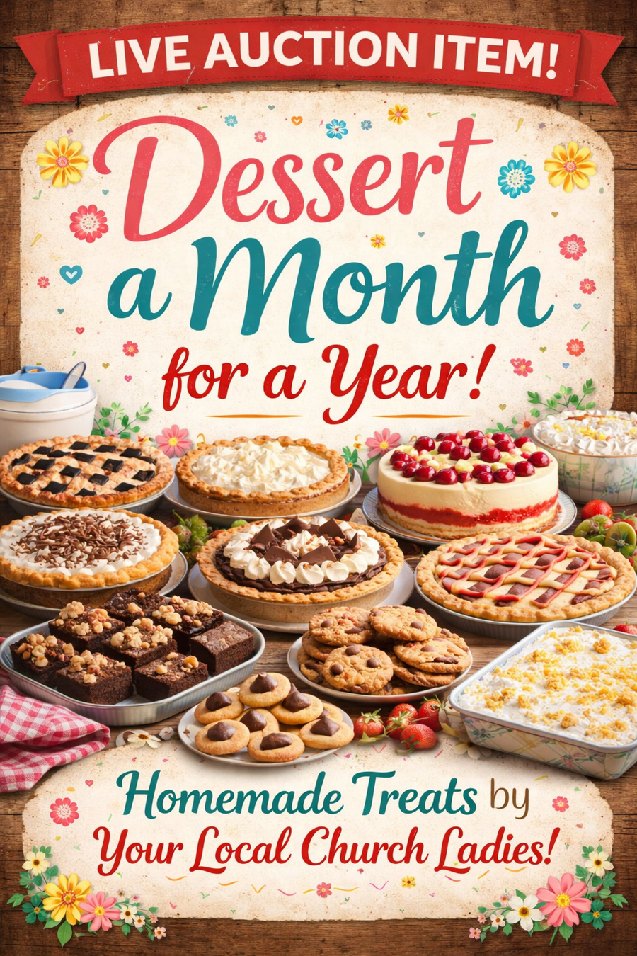 Enjoy a full year of homemade goodness with this special A Year of Sweet Desserts package—prepared lovingly by local church ladies, each dessert is made to delight and inspire!
