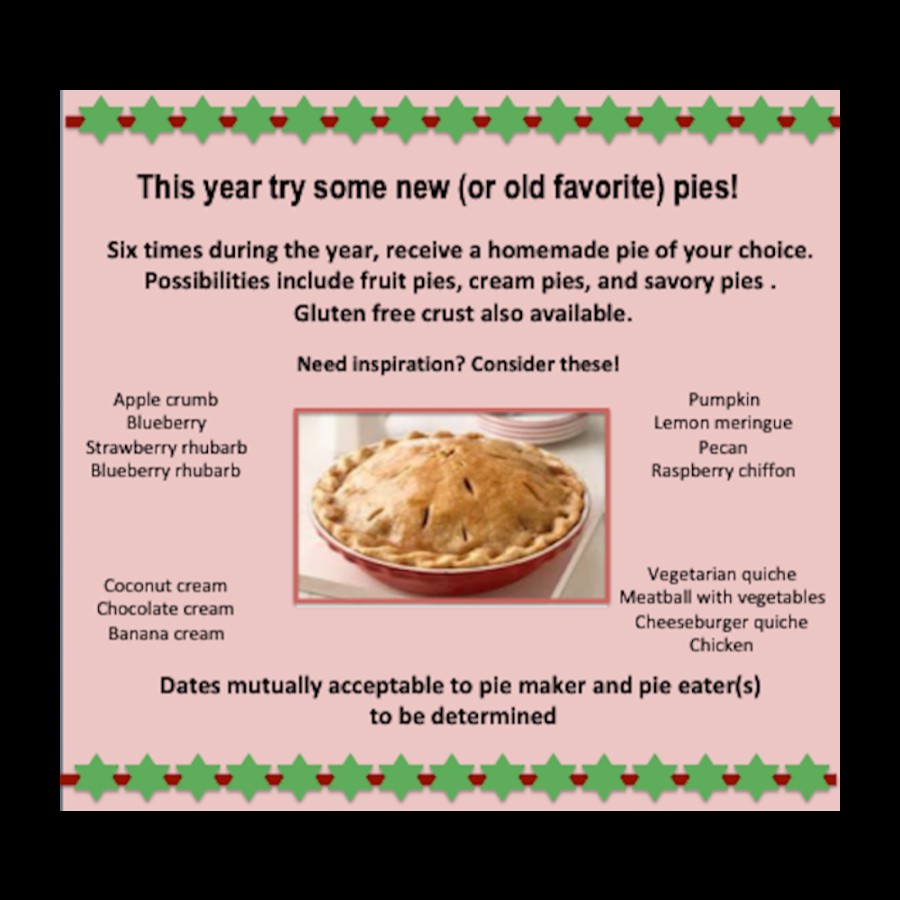 Six times during the year, receive a homemade pie of your choice. Possibilities include fruit pies, cream pies, and savory pies. Gluten free crust also available.Dates mutually acceptable to pie maker and pie eater(s) to be determined.
