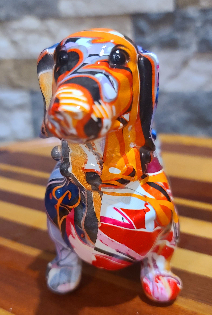 Abstract Dachshund- resin art piece with Streetwise Charm; 8x5.3x3” This dachshund is a pint-sized canvas of chaos and charisma, dipped in pure artistic rebellion. It’s crafted from resin and decked out in riot of graffiti-inspired color- think pop art meets street-style with a splash of art-deco drama. Vivid swirls, scribbles and bold geometric patterns collide across its sleek body, making it the ultimate statement piece for anyone who loves their decor loud, proud, and unapologetically fun. Whether it’s lounging on a shelf, jazzing up your desk or adding a splash of rebellion to your entryway, this decorative doggo brings instant personality to any space. It’s resin-crafted, color-packed and totally house trained. It’s a perfect gift for dog lovers, art collectors or anyone who thinks beige is boring. This charming little guy is 8” long (from nose to tail) 5.3” tall, and 3” in width, from paw to paw. These graffiti pups vary slightly (in color) as each one is hand-painted