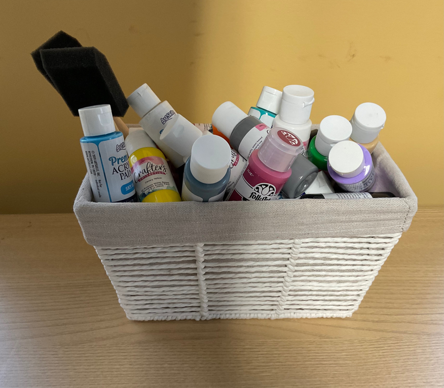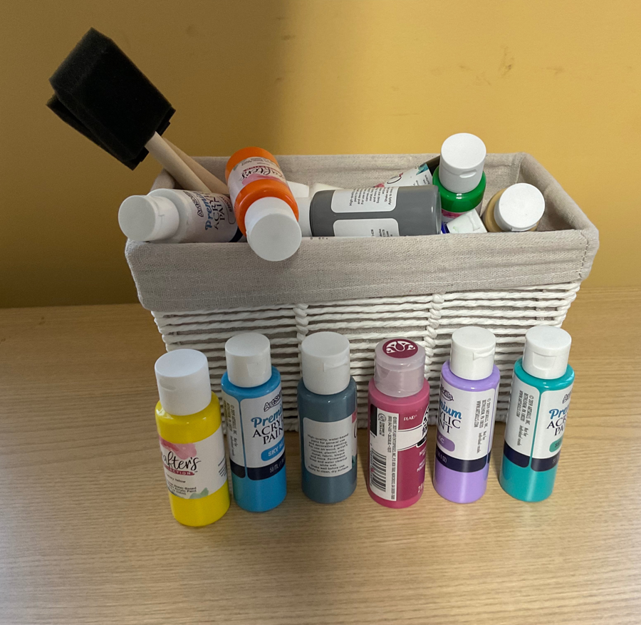 A basket full of acrylic paints for the artist in you. 30 2 ounce bottles, assorted colors, two foam brushes and a sturdy string basket.
