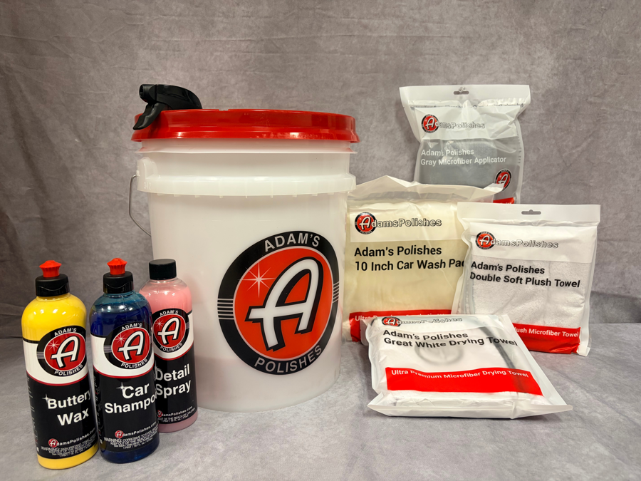Includes bucket w/lid, bucket grid, Butter Wax, Car Shampoo, Detail Spray, Gray Microfiber Applicator, 10" Car Wash Pad, Double Soft Plush Towel and Great White Drying Towel.