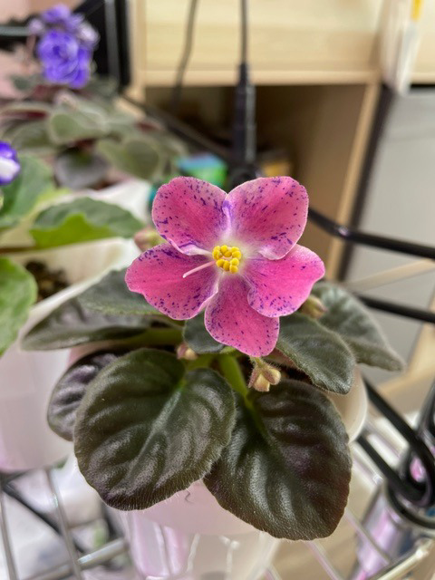 This African Violet is full of surprises! Star-shaped flowers with pink, white, and purple. No two flowers alike! Just water it once a week and keep them in indirect but bright light.