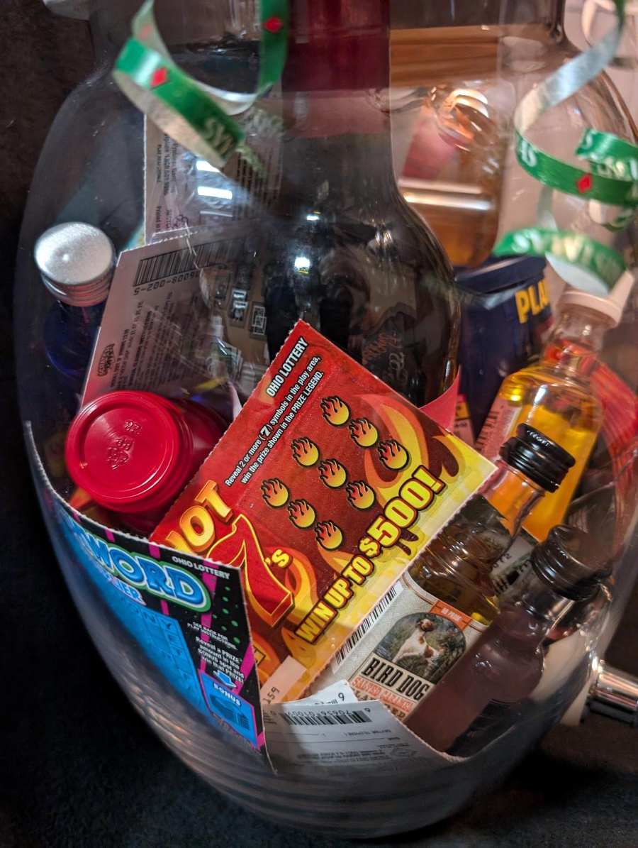 This Glass beverage dispenser is packed full of scratch off lottery tickets, assorted nuts, bottle of Hallmark Red Wine, mini-bottles of assorted alcohol, red solo shot cups, slim jims, a fun alcohol-lottery themed bundle!