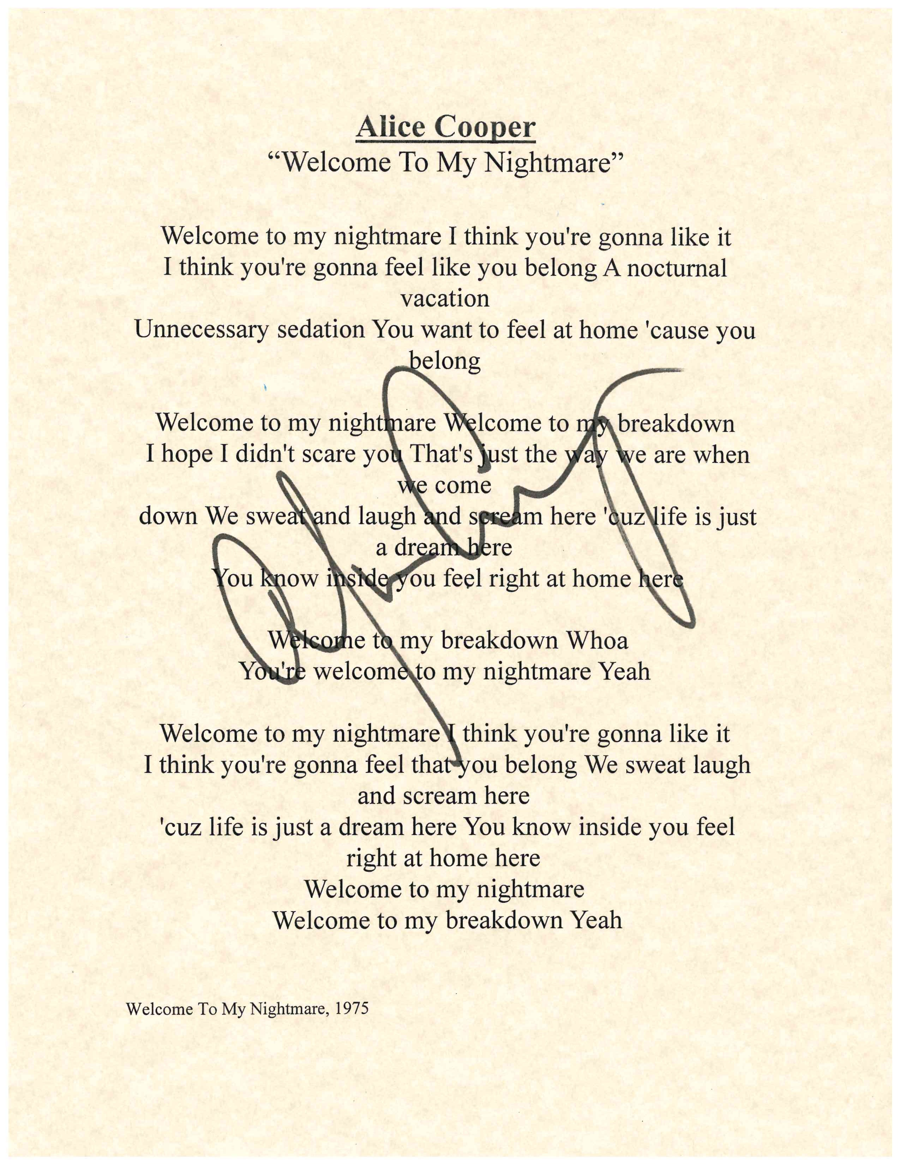 Alice Cooper Signed "My Nightmare" Song Lyrics