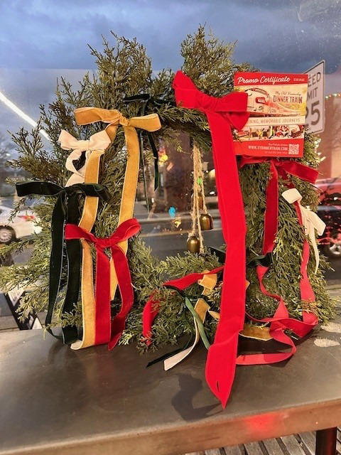 A gorgeous wreath adorned with satin bows and bells. Comes with 2 Tickets to the My Old Kentucky Dinner Train