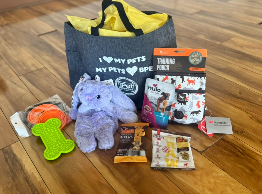 Bend Pet Express makes holiday shopping for your best pal easy with this basket full of all the goodies you'll need! This gift basket has $75 worth of pet items inside including a Petlou rabbit toy, P.L.A.Y. deluxe training pouch, Pet Naturals lick mat, Instinct Raw Boost mixer sample, Nulo hydration pouch, Primal Kibble in the Raw sample, and BPE swag bag with tote, bowl, and lid.