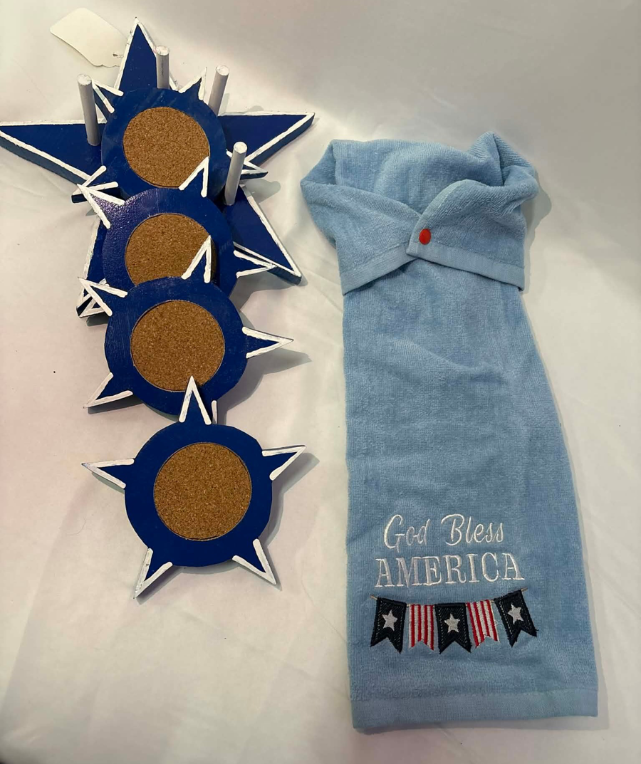 Avery's Avenue: MD America Tee Holly-Mer-Clay: 2 Sets of Earrings VFW: Hat Merl's Wood Craft: Star Coasters Dish Towel