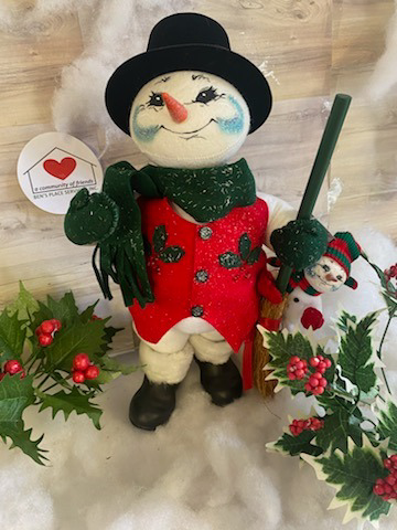 Vintage Anna Lee 2005 Snowman with child snowman on a broomstick.