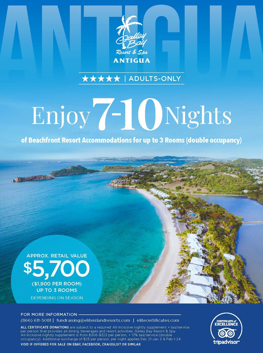 APPROX. RETAIL VALUE $5,700 ($1,900 PER ROOM) UP TO 3 ROOMS DEPENDING ON SEASON ALL CERTIFICATE DONATIONS are subject to a required All-Inclusive nightly supplement + tax/ service per person that provides all dining, beverages and resort activities. Pineapple Beach Club All-Inclusive nightly supplement is $150 per person, + 17% tax/service (double occupancy). Additional surcharge of $25 per person, per night applies Dec 21-Jan 3 & Feb 1-24.