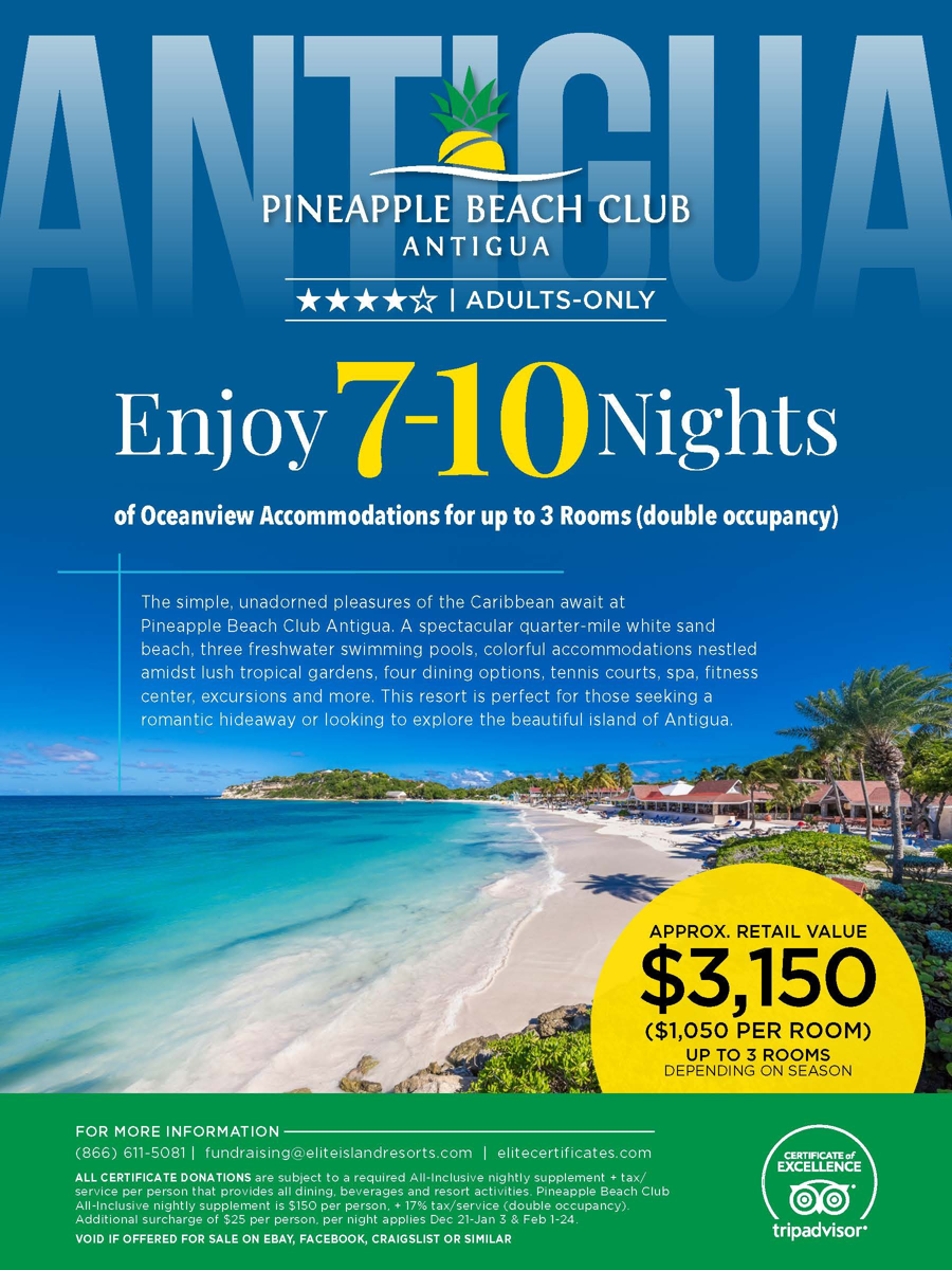 The simple, unadorned pleasures of the Caribbean await at Pineapple Beach Club Antigua. A spectacular quarter-mile white sand beach, three freshwater swimming pools, colorful accommodations nestled amidst lush tropical gardens, four dining options, tennis courts, spa, fitness center, excursions and more. This resort is perfect for those seeking a romantic hideaway or looking to explore the beautiful island of Antigua. APPROX. RETAIL VALUE $3,150 ($1,050 PER ROOM) UP TO 3 ROOMS DEPENDING ON SEASON ALL CERTIFICATE DONATIONS are subject to a required All-Inclusive nightly supplement + tax/ service per person that provides all dining, beverages and resort activities. Pineapple Beach Club All-Inclusive nightly supplement is $150 per person, + 17% tax/service (double occupancy). Additional surcharge of $25 per person, per night applies Dec 21-Jan 3 & Feb 1-24.