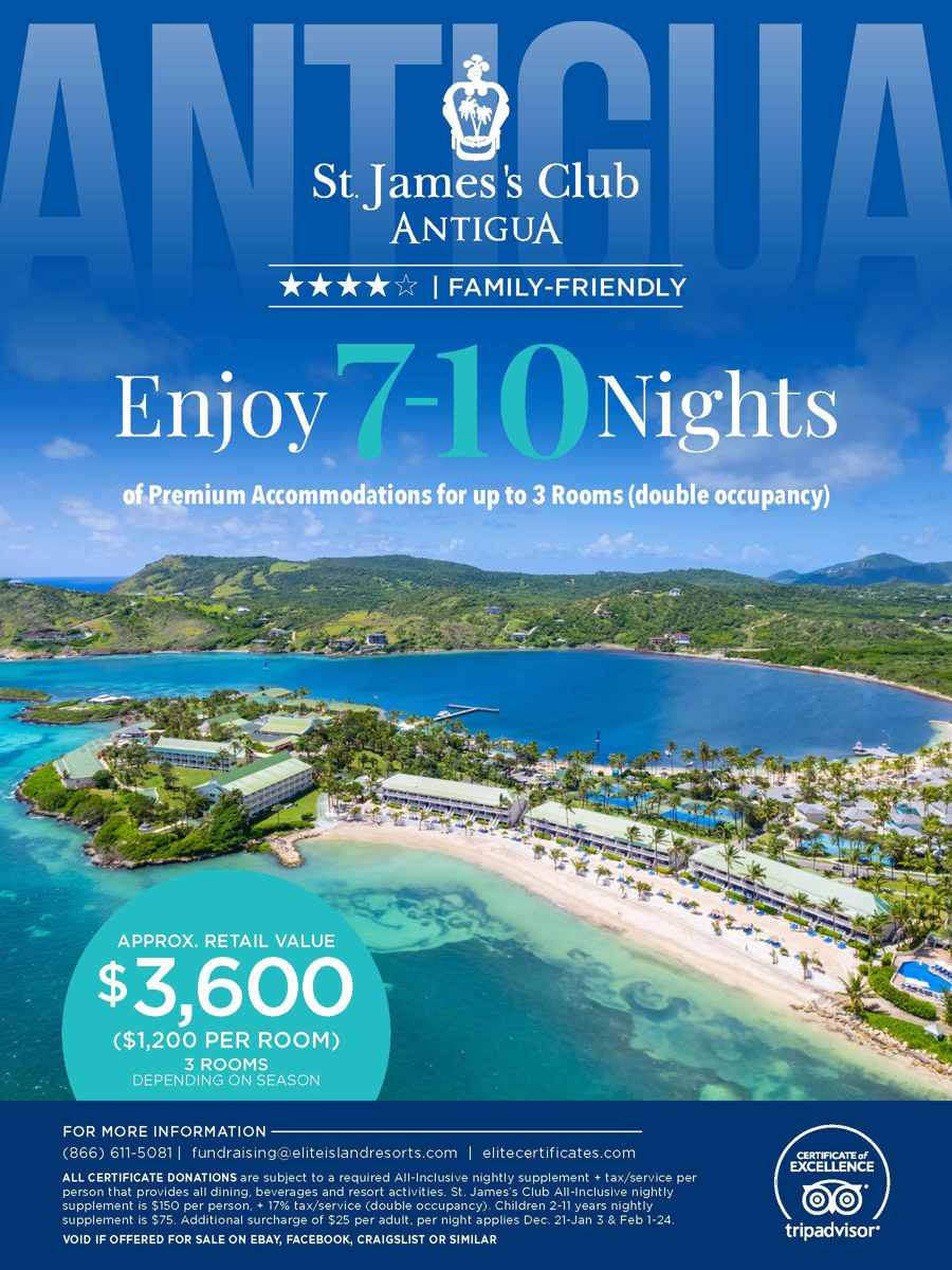 APPROX. RETAIL VALUE $3,600 ($1,200 PER ROOM) UP TO 3 ROOMS DEPENDING ON SEASON ALL CERTIFICATE DONATIONS are subject to a required All-Inclusive nightly supplement + tax/ service per person that provides all dining, beverages and resort activities. Pineapple Beach Club All-Inclusive nightly supplement is $150 per person, + 17% tax/service (double occupancy). Additional surcharge of $25 per person, per night applies Dec 21-Jan 3 & Feb 1-24.
