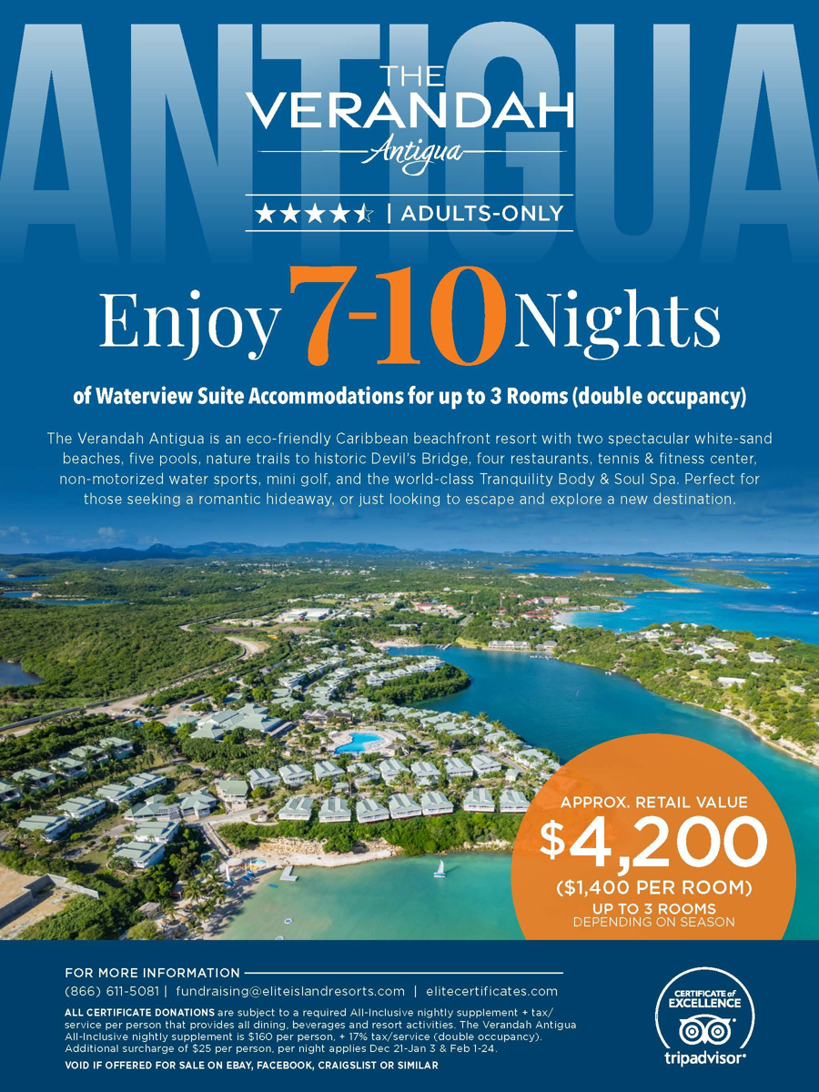 The Verandah Antigua is an eco-friendly Caribbean beachfront resort with two spectacular white-sand beaches, five pools, nature trails to historic Devil’s Bridge, four restaurants, tennis & fitness center, non-motorized water sports, mini golf, and the world-class Tranquility Body & Soul Spa. Perfect for those seeking a romantic hideaway, or just looking to escape and explore a new destination. APPROX. RETAIL VALUE $4,200 ($1,400 PER ROOM) UP TO 3 ROOMS DEPENDING ON SEASON ALL CERTIFICATE DONATIONS are subject to a required All-Inclusive nightly supplement + tax/ service per person that provides all dining, beverages and resort activities. Pineapple Beach Club All-Inclusive nightly supplement is $150 per person, + 17% tax/service (double occupancy). Additional surcharge of $25 per person, per night applies Dec 21-Jan 3 & Feb 1-24.