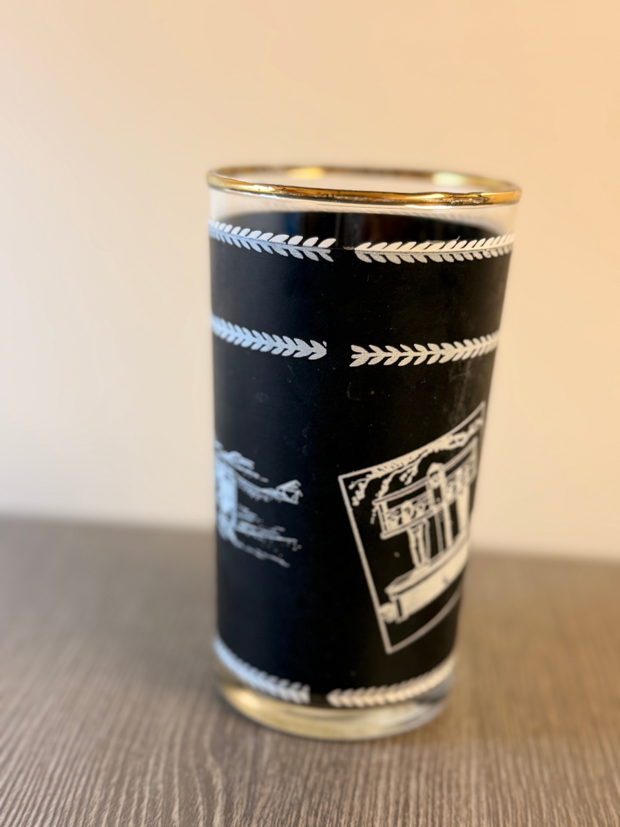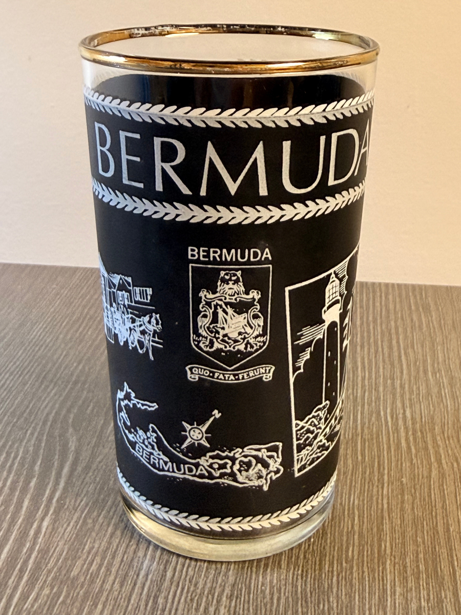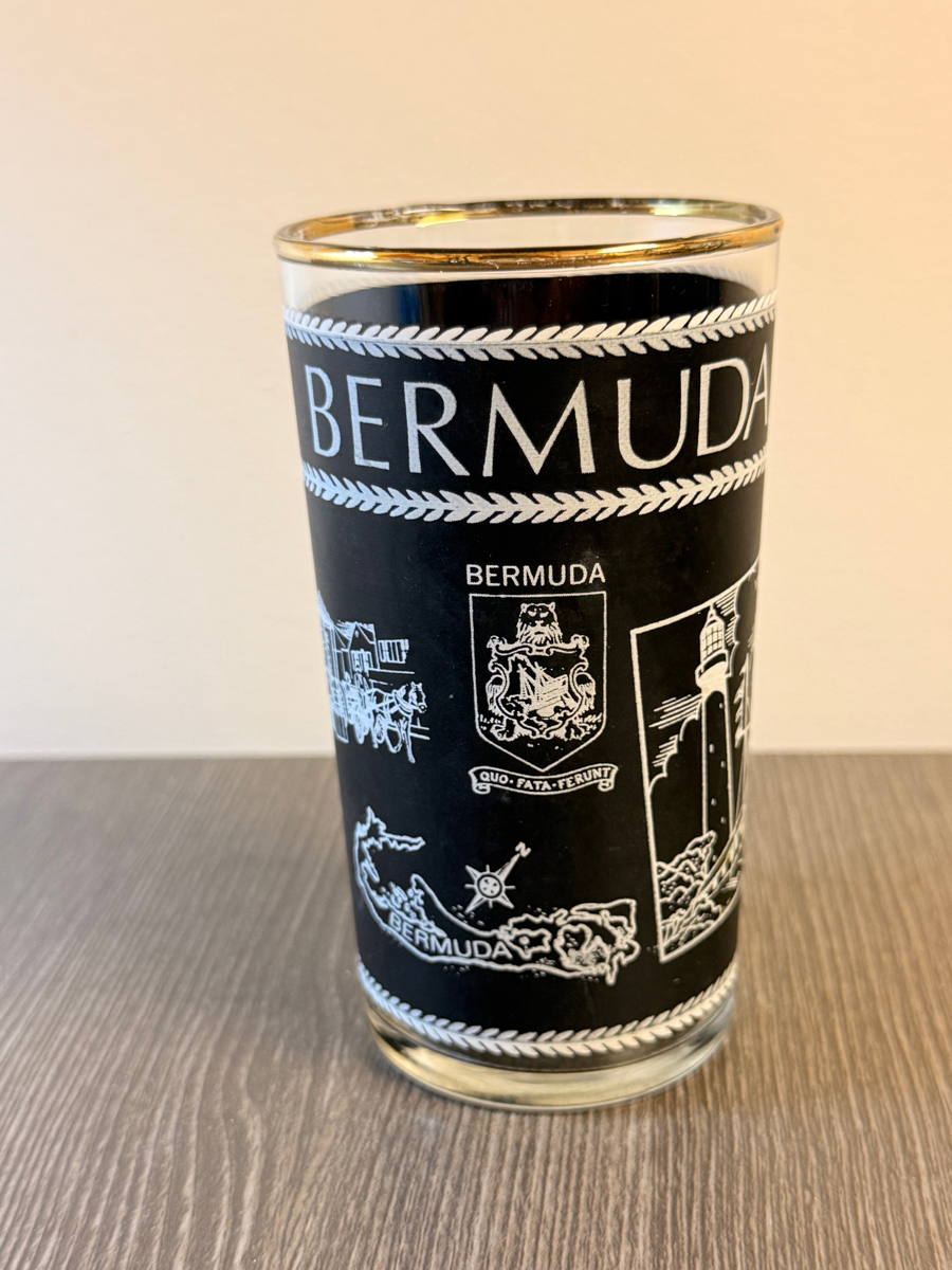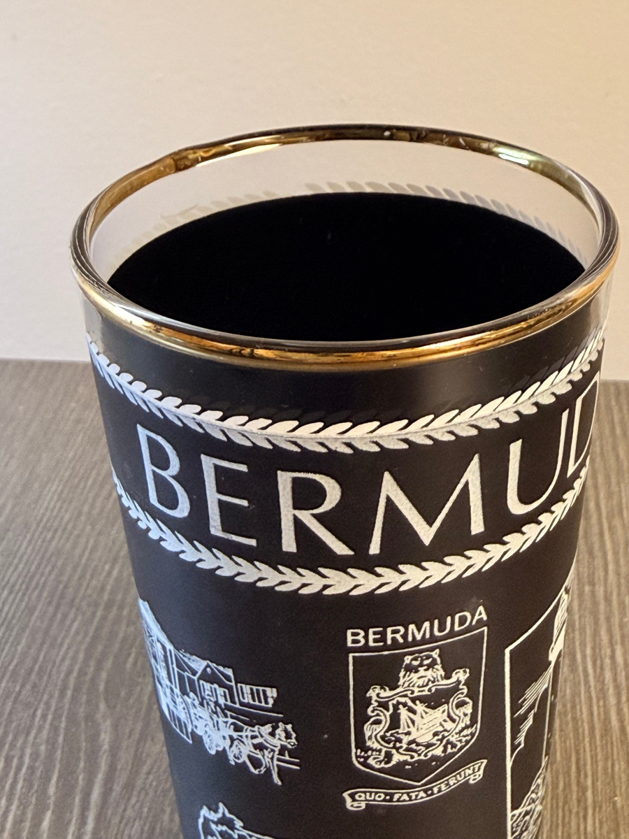 This item is a vintage 1960s Bermuda-themed drinking glass, featuring a black design with white illustrations and a gold-colored rim. The design features white graphics including a lighthouse, a horse-drawn carriage, the Bermuda map, and the Bermuda coat of arms with the motto "Quo Fata Ferunt". This glass has been seen for resale in the UK for the retail price listed.