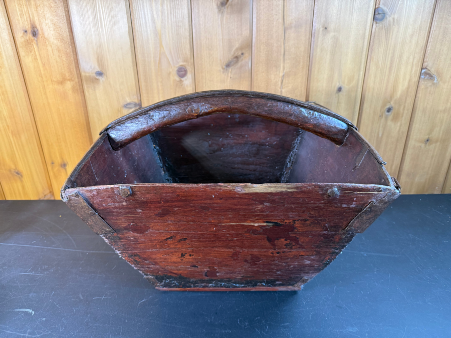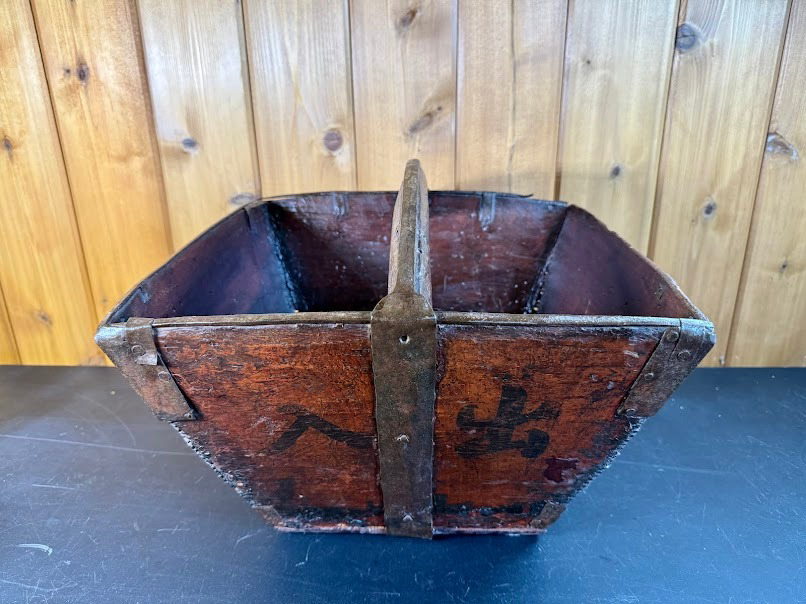 A very old wooden vessel embellished with faded Chinese characters. It was used to measure a standard amount of grain, usually rice. 15 x 14 x 9 inches.