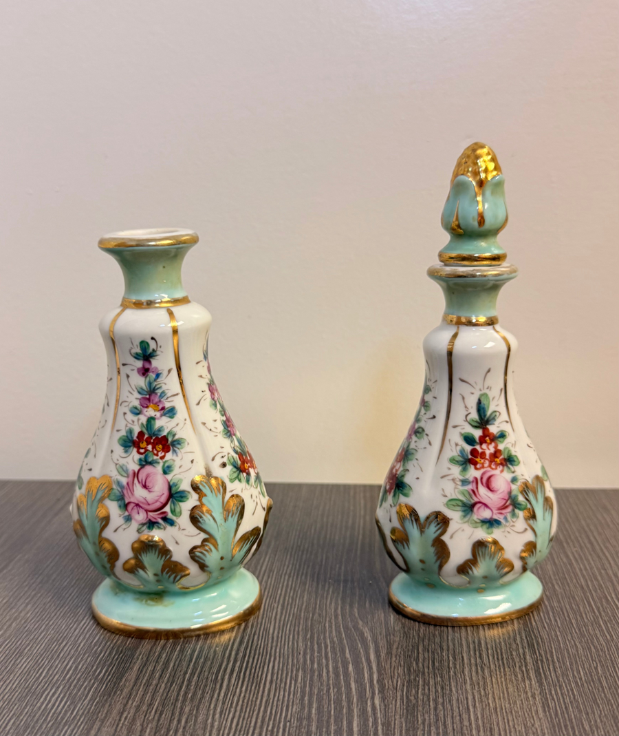These are antique porcelain scent bottles from the mid-19th century. They are made in France and are handpainted. These bottles are known for their rococo style, featuring turquoise or "sky blue" glazing enhanced with extensive gold gilding and hand-painted floral decorations. They are a highly sought collector’s piece. There is only one stopper but it fits both bottles.