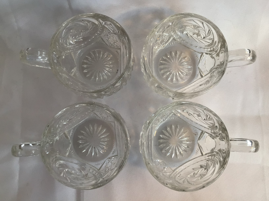 22 Pressed glass cups Unwrapped 6 cups- the rest are still tightly rolled in newspaper!