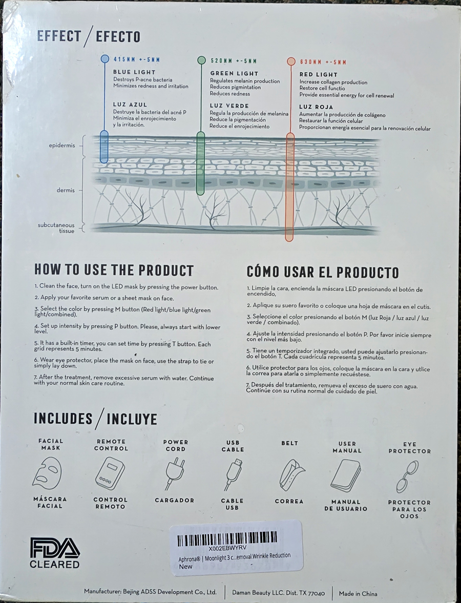 New item: VISIBLE RESULTS IN LESS TIME – Experience the power of LED light therapy with Aphrona’s advanced face mask, designed to rejuvenate and transform your skin. Featuring 150 high-purity (99%) narrow-spectrum LED chips, our mask delivers optimal energy distribution for maximum effectiveness—from the comfort of your home. CUTTING-EDGE TECHNOLOGY – Harness the power of 630nm±5nm red light to reduce wrinkles and 415nm±5nm blue light to combat mild to moderate acne. Designed for precision, our mask delivers targeted wavelengths with an energy output of 30 to 80mW/cm² for optimal skin absorption. Enjoy flexible treatment durations from 5 to 50 minutes (default 15 minutes) to suit your skincare needs—safe, effective, and effortlessly customizable. FDA CLEARED – Unlike many beauty products that promise results without proof, Aphrona’s LED face mask is FDA 510(k) cleared as a Class II medical device. Our patented LED technology is backed by science, providing visible improvements in skin texture, tone, and clarity—so you can invest in beauty that actually works. NON-INVASIVE & HANDS-FREE TREATMENT – Designed for effortless skincare, our mask is UV-free, non-invasive, and requires zero downtime. Simply cleanse your face, apply a light serum, wear the mask, and relax. For best results, apply sunscreen after treatment and wipe down the mask with a damp cloth to remove any residue.
