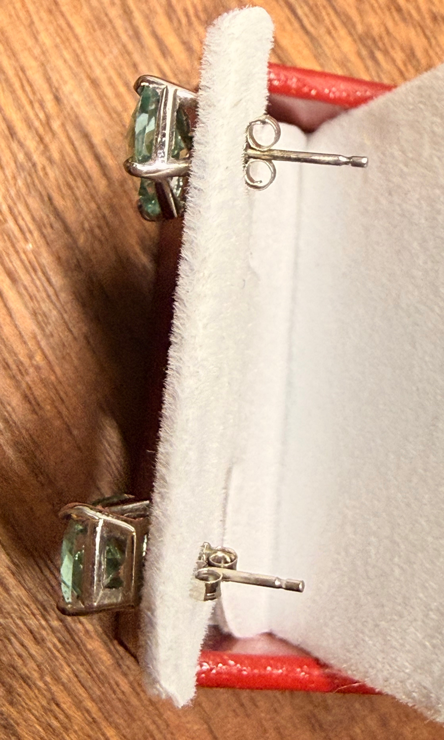 These gorgeous gemstone earrings are set in sterling silver. The gems are synthetic but in an emerald cut to shine brightly. They are a hint to our Bermuda emerald seas! A true treasure. Note: They have been seen by a local gemmologist for quality and gold content.