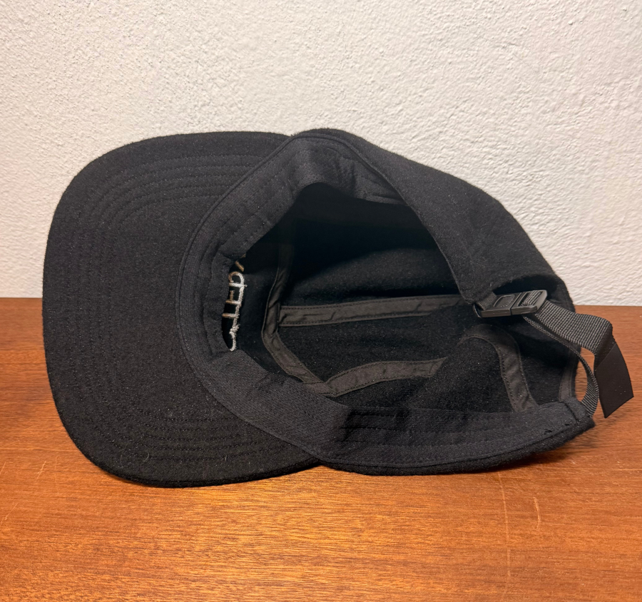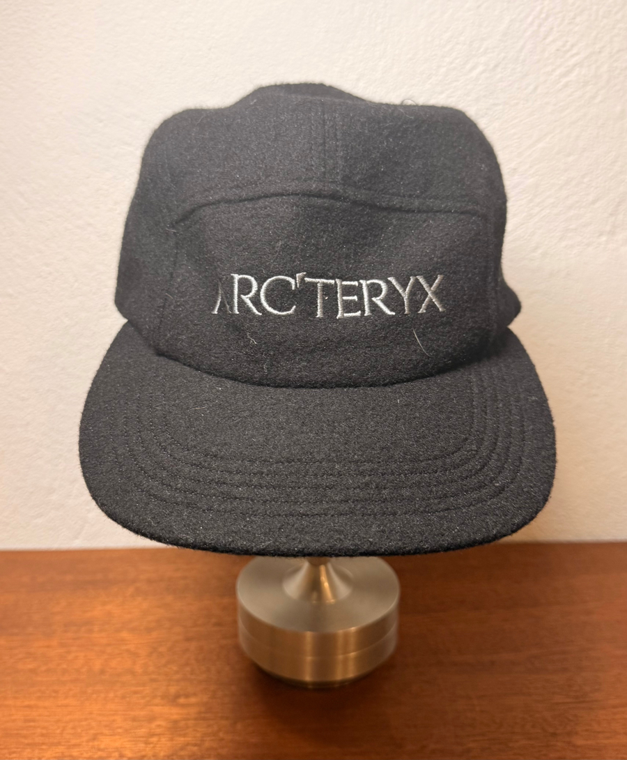This item is an Arc'teryx Five Panel Wool Hat, which is designed for warmth and breathability using a lightweight wool-blend fabric. It has the logo for Arc’teryx on the front. The cap features an adjustable strap on the back that has a clasp. It can be used as a unisex hat. Wear it for casual, travel, or to the sports field.