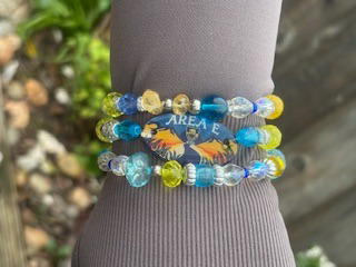 Set of 3 bracelets featuring Area E shield, blue, gold, crystal, and silver beads.