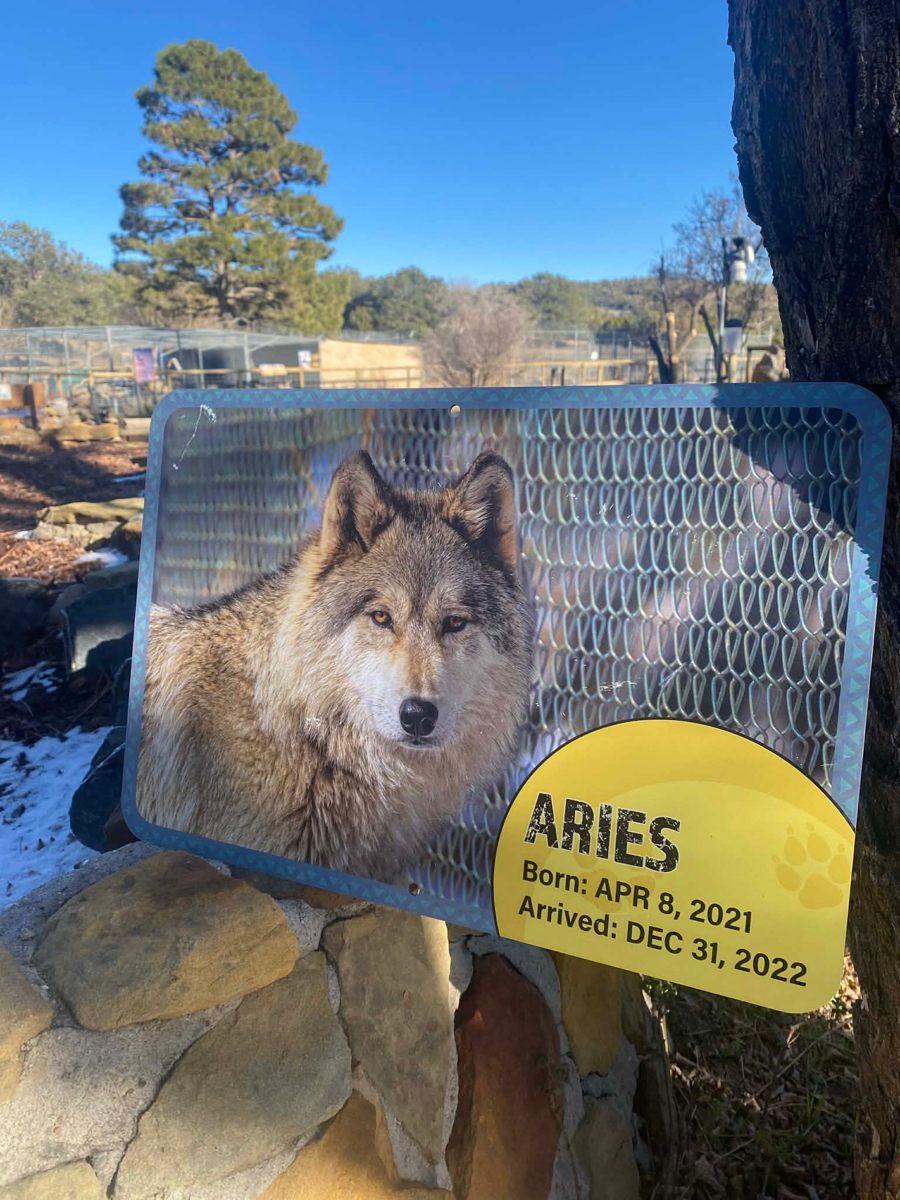 Aries was a high-content wolfdog that came to Wild Spirit in 2022, sharing only a few short years with us before passing away from cancer in 2024. He was only 3 years old at the time, and he is still deeply missed to this day. Aries loved everyone he met, so much so that he was nicknamed "piddles" because he got so excited to see people that he would submissive-pee while approaching them. While he lived at Wild Spirit, this sign was hung on his enclosure. It is roughly 19.2" X 13.2", scratched but in good condition otherwise. Our hope is to use funds raised through the sale of these signs to purchase new "In Memory" versions of each of our late rescues. <3