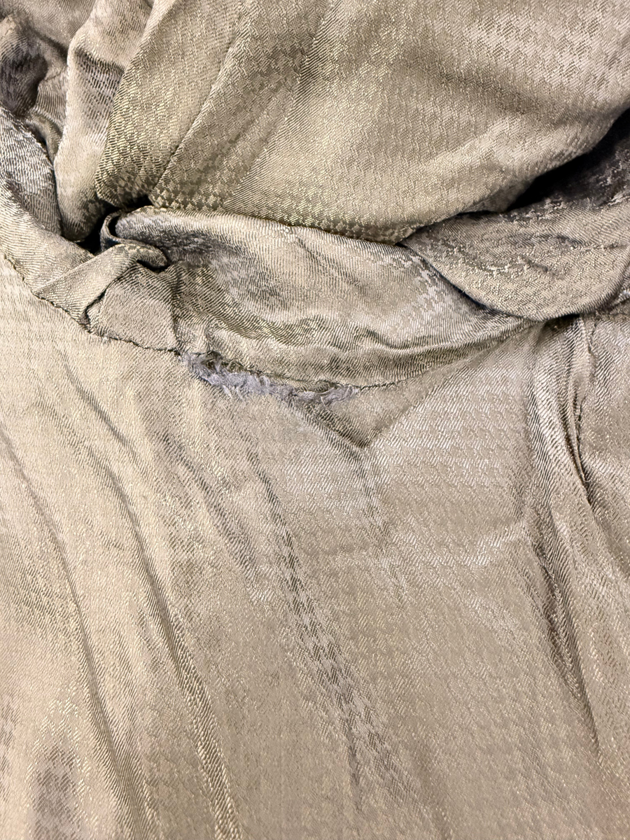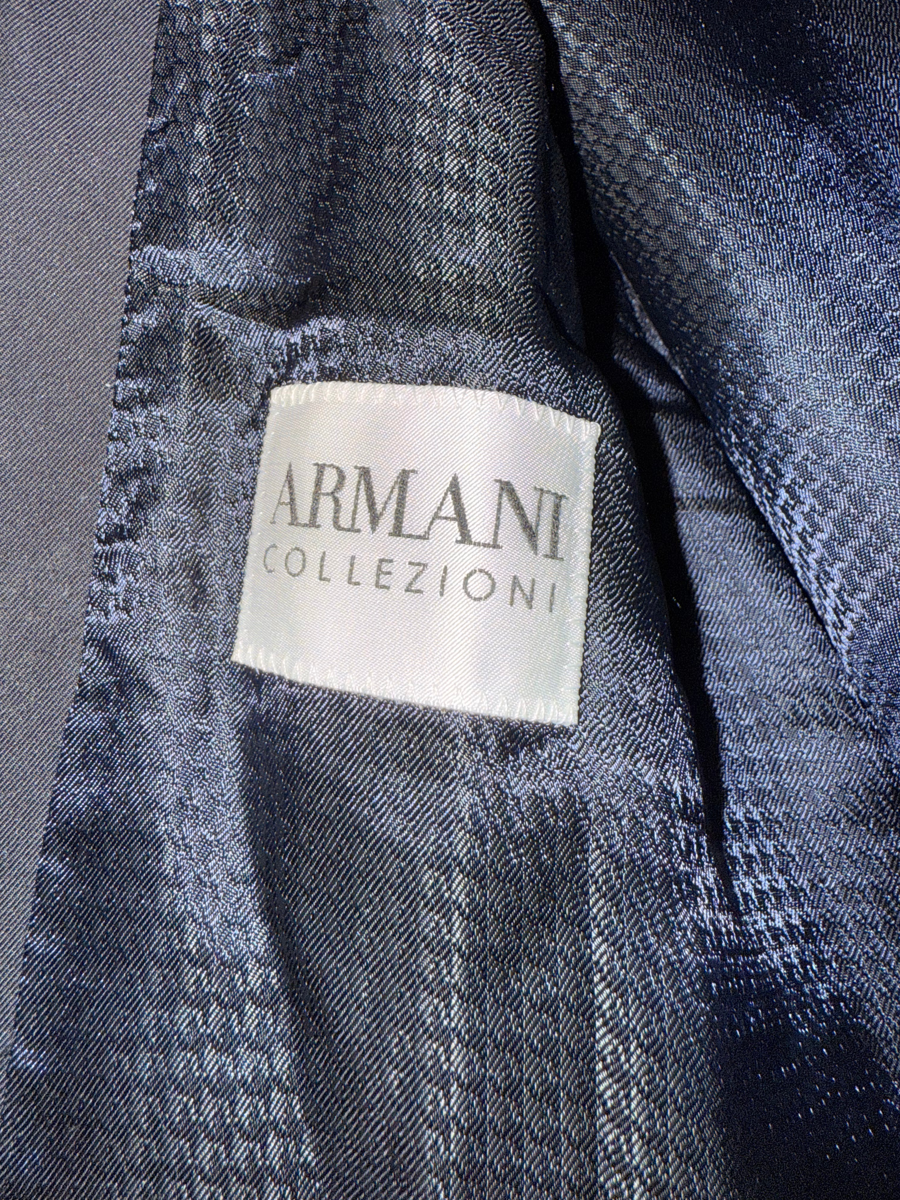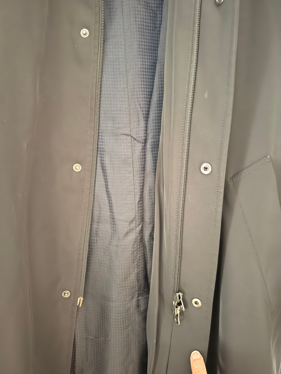 A wet walk to the office? We have the answer for that. This Armani rain coat is lined and waterproof. It has a zipper as well as snaps to conceal the zipper. There is a minor tear on the inside lining of the right armpit which can easily be hand stitched. Color: Black Condition: Gently used Size: L , Length: 36 inches
