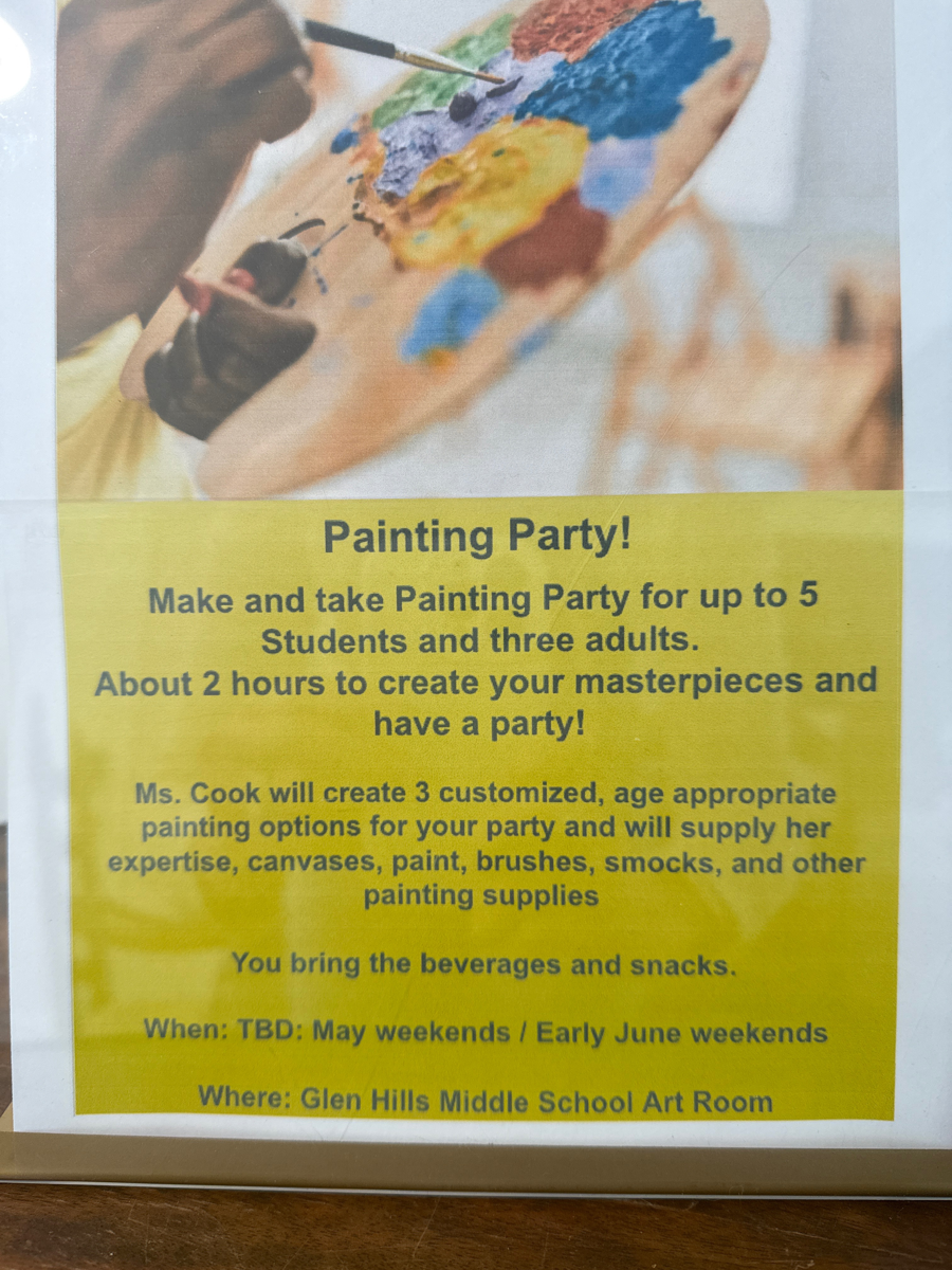 "Gather your group for a fun, creative make-and-take painting party! This experience includes a 2-hour guided session for up to 5 students and 3 adults in The Glen Hills Middle School Art Room.