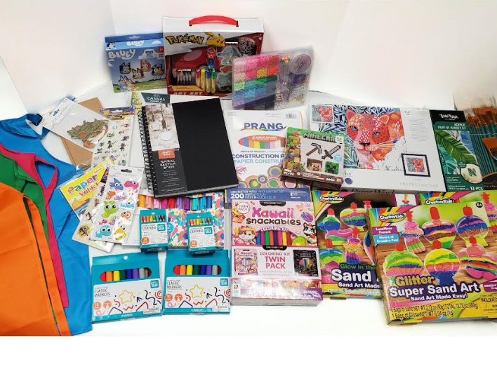 The winning bidder will take home a basket filled with arts and crafts! This basket includes 4 aprons, classic markers, acrylic markers, crayons, stickers, paper vehicle crafts, spiral sketch book, canvases, construction paper, sand art kit, glitter sand art kit, Kawaii snackables coloring kit, Minecraft perler set, paint by number kit, Paint Works kit, paint brushes, bracelet making kit, Pokemon Art Set, and Bluey perler set.