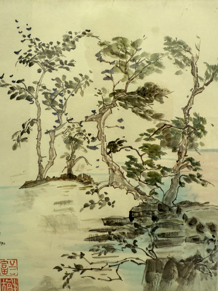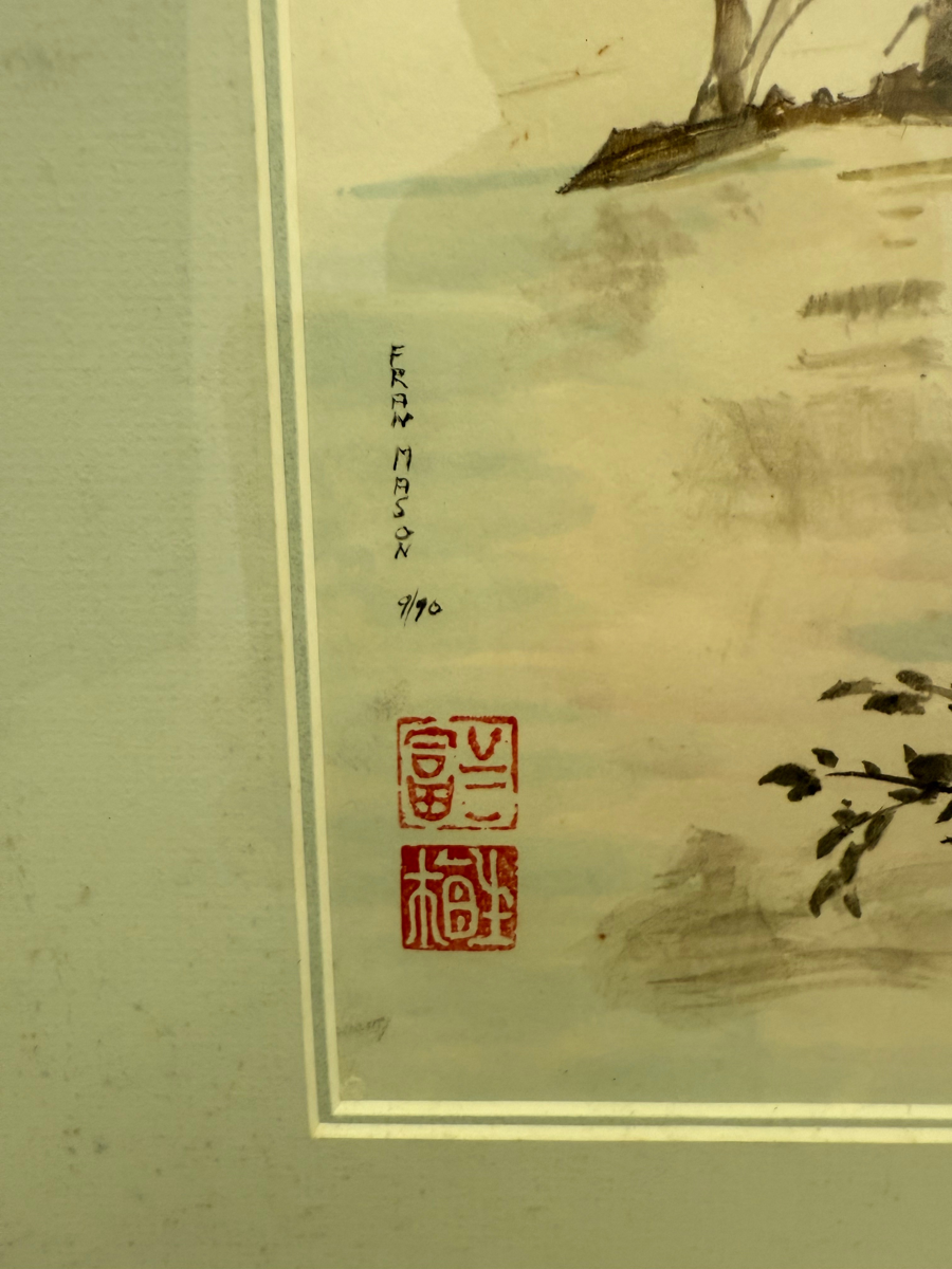 This Asian-style ink and wash painting is by artist Fran Mason. The artwork uses traditional East Asian techniques involving a brush and ink (sumi-e) with light watercolor washes on paper, a style known as shan shui in Chinese, meaning "mountain-water". The painting depicts a natural landscape featuring twisted trees and foliage on rocky cliffs above water, a common subject in Chinese and Japanese art symbolizing longevity and resilience. The red square seals, or hanko/inkan, are characteristic of East Asian art and typically denote the artist's name. The inscription "9/90" is likely a date reference (September 1990). The art is presented in a simple, thin gold-toned frame with a wide, off-white or cream-colored matting and is ready to hang.