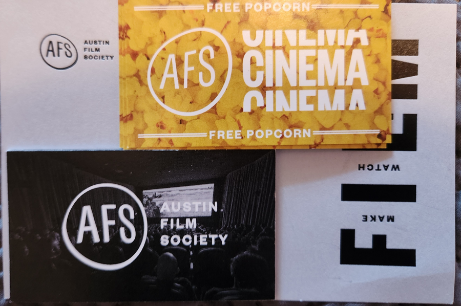 Austin Film Society has donated 4 Movie Passes and 4 Popcorn Coupons. Expires 9-30-26. This item will be mailed to the winner.