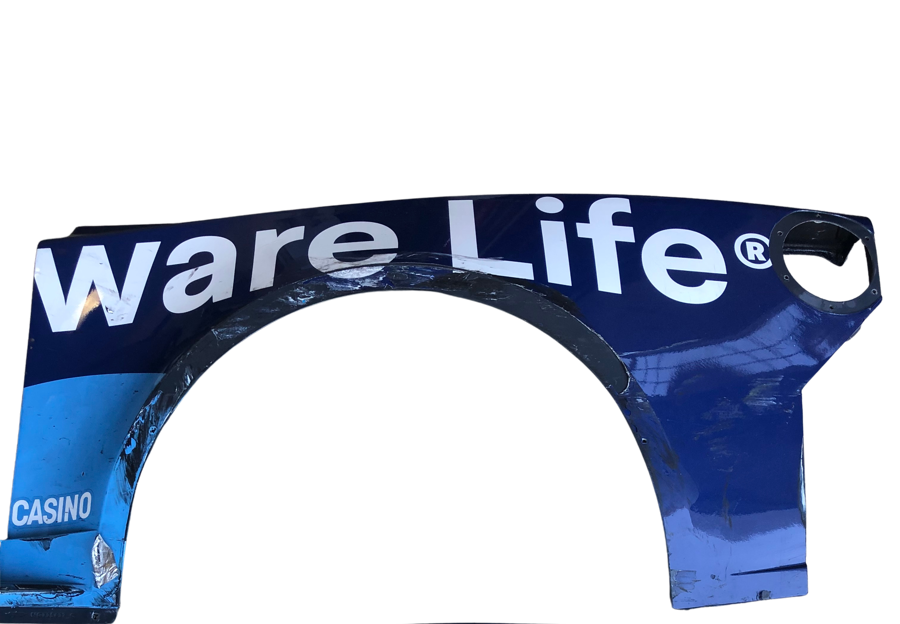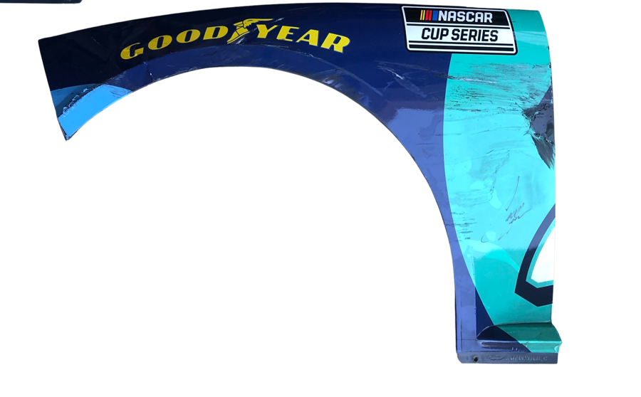 Autographed Front Fender and Left Rear Quarter Panel from Carson Hocevar’s #77 NASCAR Cup Car sponsored by Delaware Life.