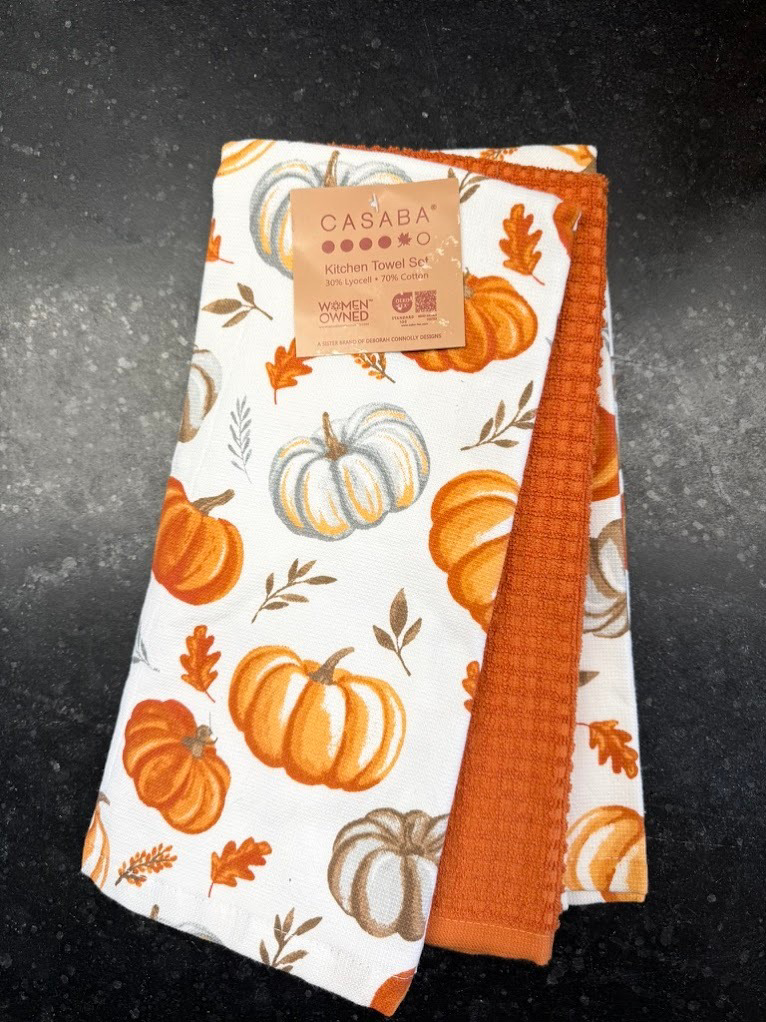 Welcome fall with this assortment of autumnal gifts including orange and brown acorn salt and pepper shakers, a "Hello Autumn" banner, checkered chef's apron, 3 dish towels and a ceramic canister decorated with a leaf pattern. All presented in an oblong basket, a great gift that you may want to keep!