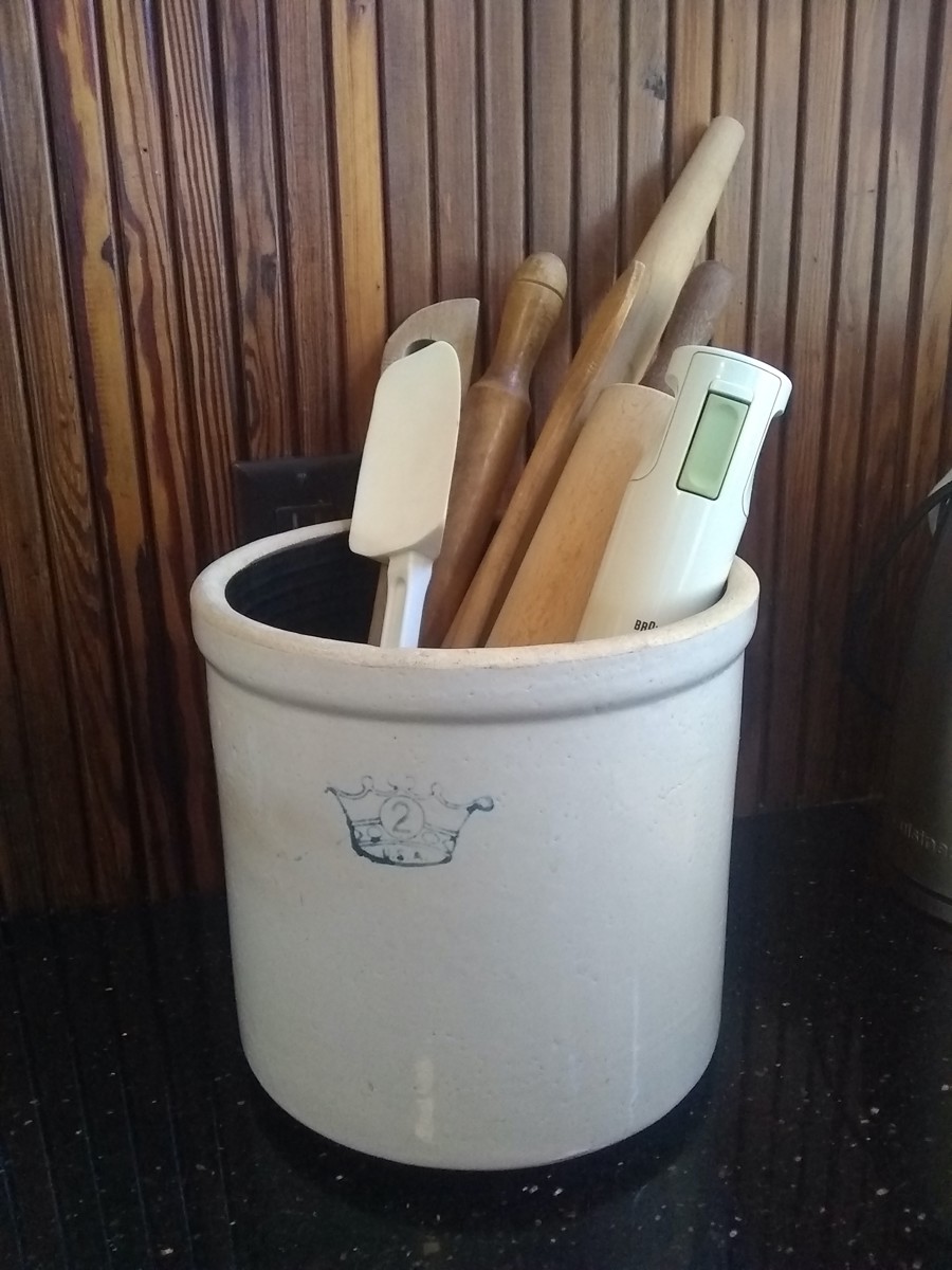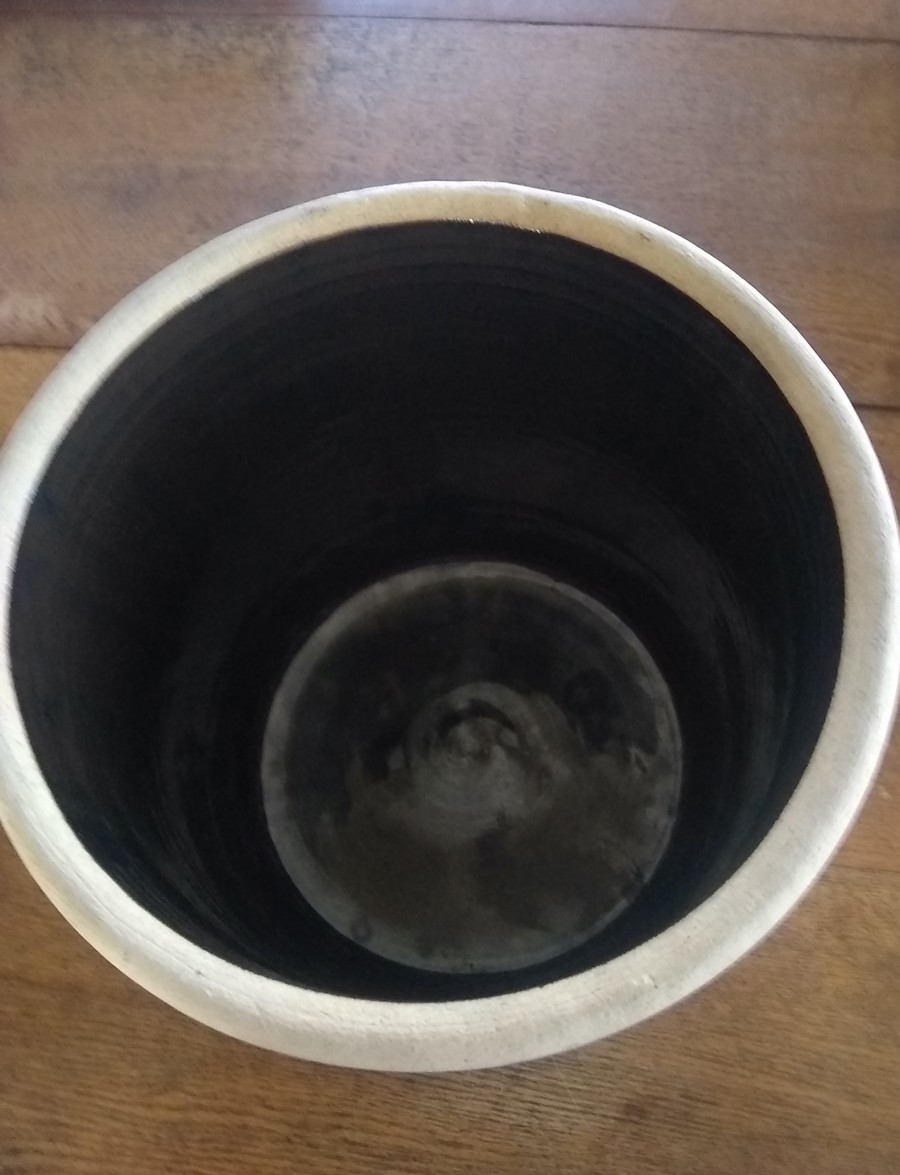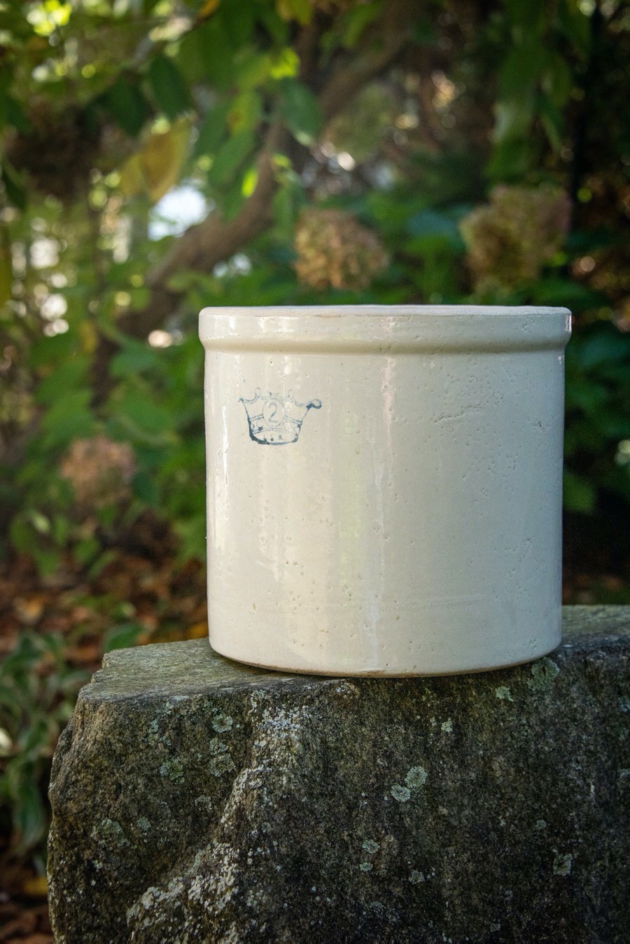 This Robinson Ransbottom blue crown stoneware crock is in excellent condition, 9 1/2" wide by 9" tall. It is a 2 gallon size with a light beige exterior and no lid.