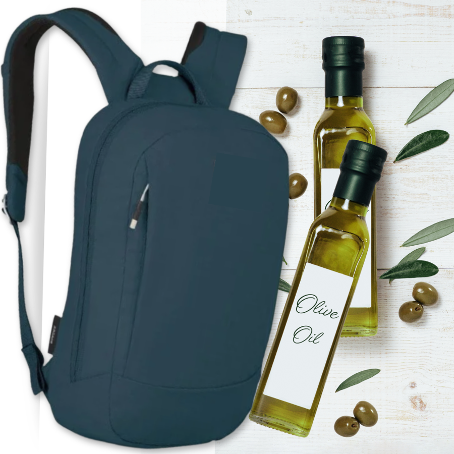 We have filled a Nordace Sienna Pro 11 Backpack with olive oil, but we (cleverly!) kept it in the bottles. A fancy and elegant backpack, perfect for a tablet, along with two (!) 750 ml bottles of this fall's harvest of Al'Ard organic extra virgin Palestine olive oil.