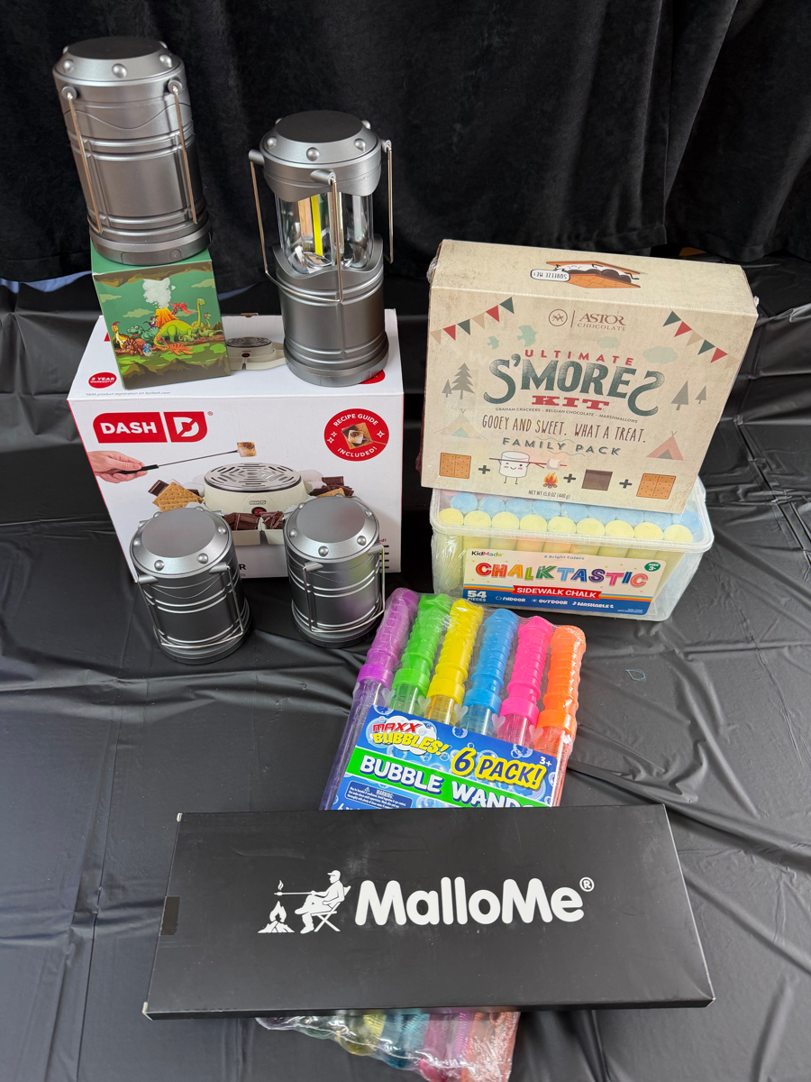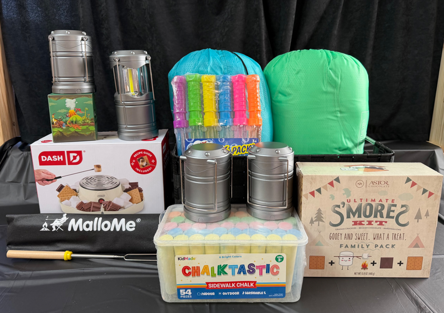 Is there really a better way to explore the great outdoors and still have all the amenities of home? Enjoy all the things you need for a night in the backyard; 2 sleeping bags, S'mores kits, 4 small lanterns, an adorable dinosaur head lamp and of course, bubbles and chalk to stay busy.
