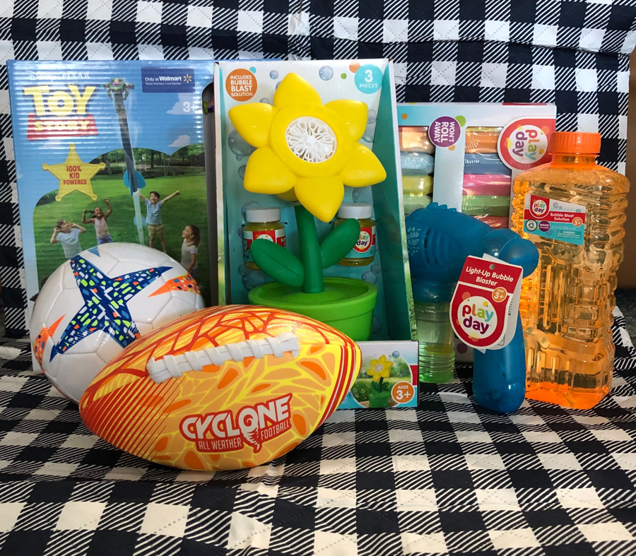 Lay out your new picnic blanket and enjoy some BBQ from Rack Shack with the $50 gift card. Then get your play on with these fun outdoor toys: mini football, mini soccer ball, a bubble machine and bubble gun with extra bubble solution, sidewalk chalk, and a Buzz Lightyear stomp rocket.