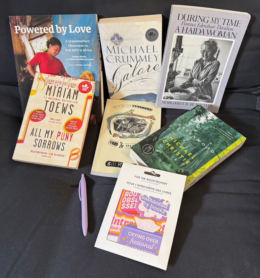 The morning book club has created a few bags of gently used and much-loved books. This bag of six diverse books, all by Canadian authors, comes with a set of fun “booktrovert” stickers and a reader’s pen.